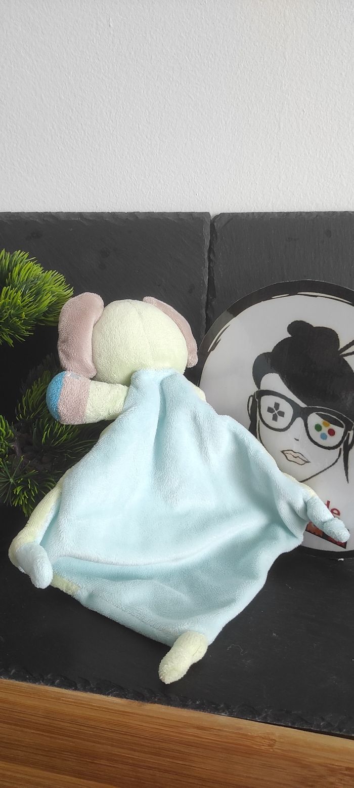 Doudou éléphant nicotoy vert bleu étoiles lune marron beige orange rond noeud