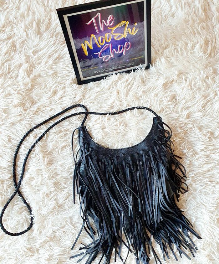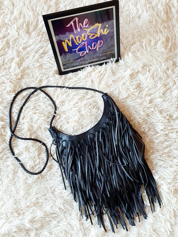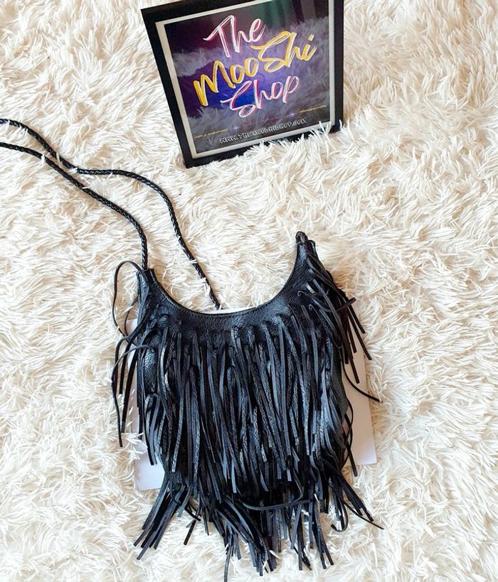 👜 Sac à main pochette demie lune simili cuir noir franges neuf bandoulière simili cuir Zida