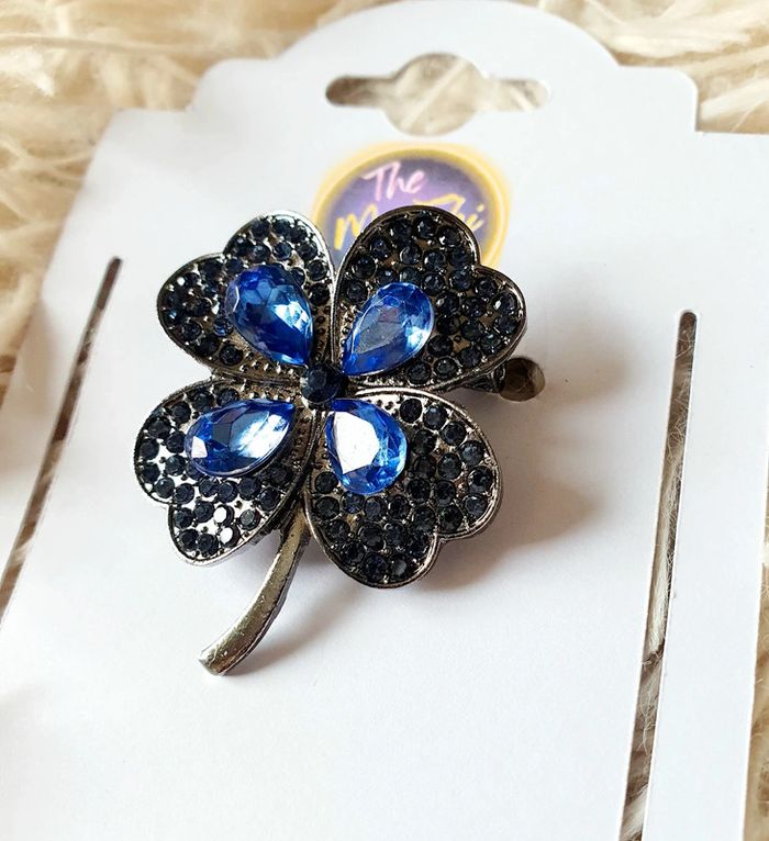 🍀 Broche trèfle à 4 feuilles porte bonheur multicolore strass bleu metal argent neuve neuf - photo numéro 7