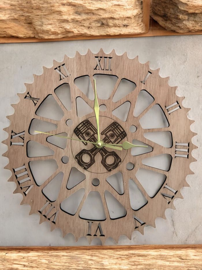 Horloge en bois Couronne de moto neuve avec mécanisme, diamètre 29 cm, fabriqué en découpe laser