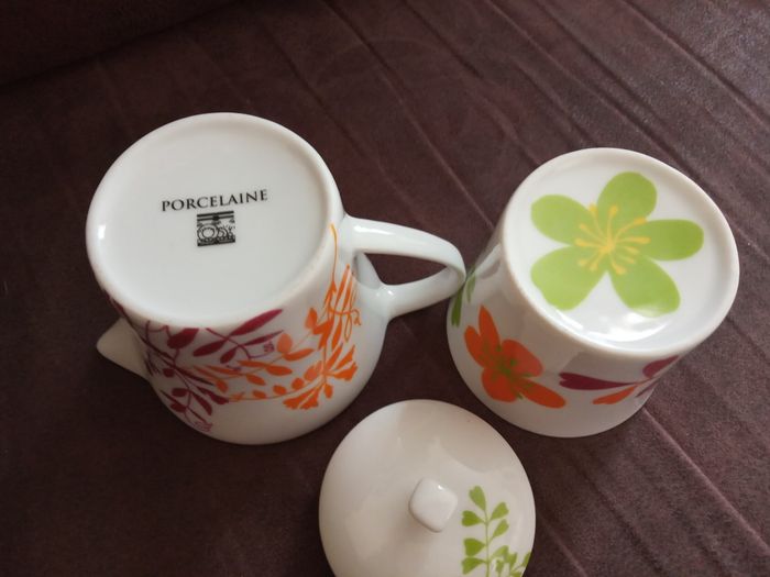 Élégant petit Ensemble Théière + Tasse assortie Contenance: pour 1 personne Couleur: Blanc avec motifs colorés Matière: Porcelaine Dimensions théière: Hauteur 8,5cm - diamètre 9,5cm Dimensions tasse: Hauteur 7,5cm - diamètre 8,5cm Ensemble comme Neuf (Vendu comme sur les photos)
