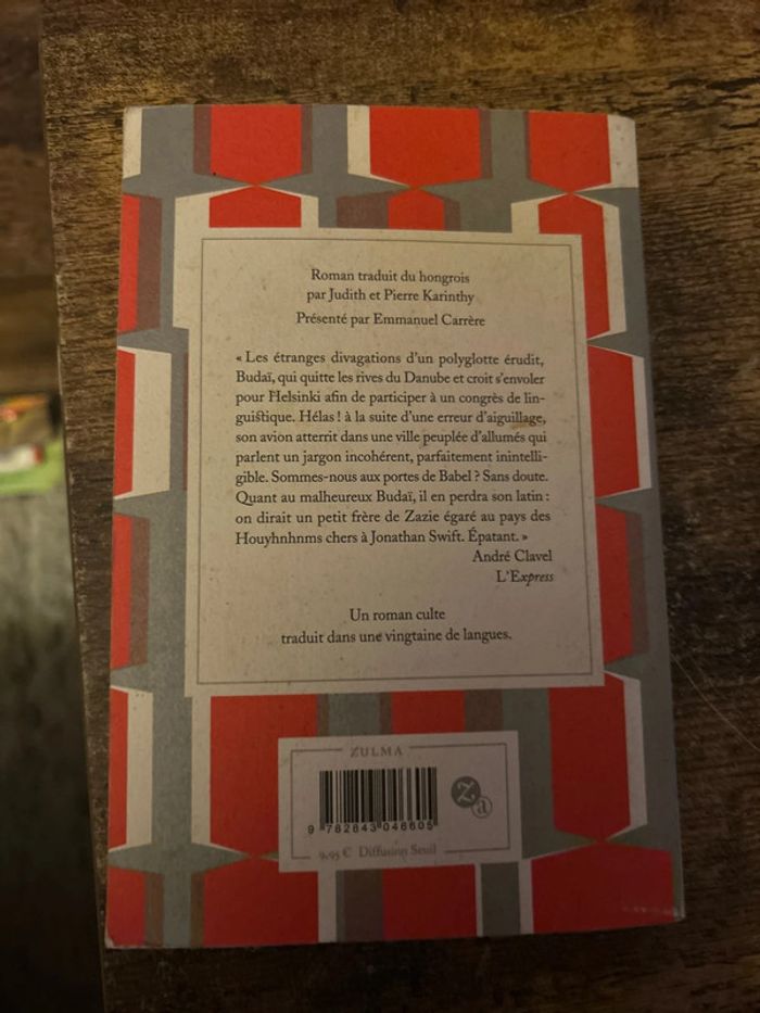 «Les étranges divagations d'un polyglotte érudit, Budaï, qui quitte les rives du Danube et croit s'envoler pour Helsinki afin de participer à un congrès de lin-guistique. Hélas ! à la suite d'une erreur d'aiguillage, son avion atterrit dans une ville peuplée d'allumés qui parlent un jargon incohérent, parfaitement inintelli-gible. Sommes-nous aux portes de Babel ? Sans doute. Quant au malheureux Budaï, il en perdra son latin : on dirait un petit frère de Zazie égaré au pays des Houyhnhnms chers à Jonathan Swift. Épatant. »