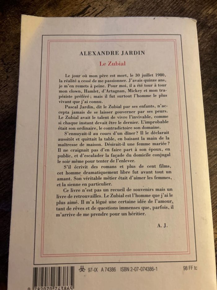 Le jour où mon père est mort, le 30 juillet 1980, la réalité a cessé de me passionner. J'avais quinze ans, je m'en remets à peine. Pour moi, il a été tour à tour mon clown, Hamlet, d'Artagnan, Mickey et mon trapéziste préféré; mais il fut surtout l'homme le plus vivant que j'ai connu. Pascal Jardin, dit le Zubial par ses enfants, n'accepta jamais de se laisser gouverner par ses peurs. Le Zubial avait le talent de vivre l'invivable, comme si chaque instant devait être le dernier. L'improbable était son ordinaire, le contradictoire son domaine. S'ennuyait-il au cours d'un dîner? Il le déclarait aussitôt et quittait la table, en baisant la main de la maîtresse de maison. Désirait-il une femme mariée ? Il ne craignait pas d'en faire part à son époux, en public, et d'escalader la façade du domicile conjugal le soir même pour tenter de l'enlever. S'il écrivit des romans et plus de cent films,