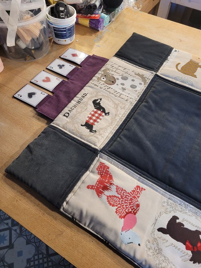 Tapis de belotte gand format. Avec tableau des points et cartes d'atouts à retourner chaque cartee. En Velours avec palet pour savoir qui doit distribuer. Vendu avec jeux de belotte, carnet et stylo. Se plis et se range partout, même dans la valise pour les vacances. Fabrication Unique artisanale.