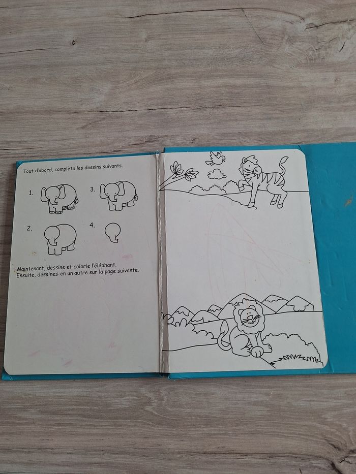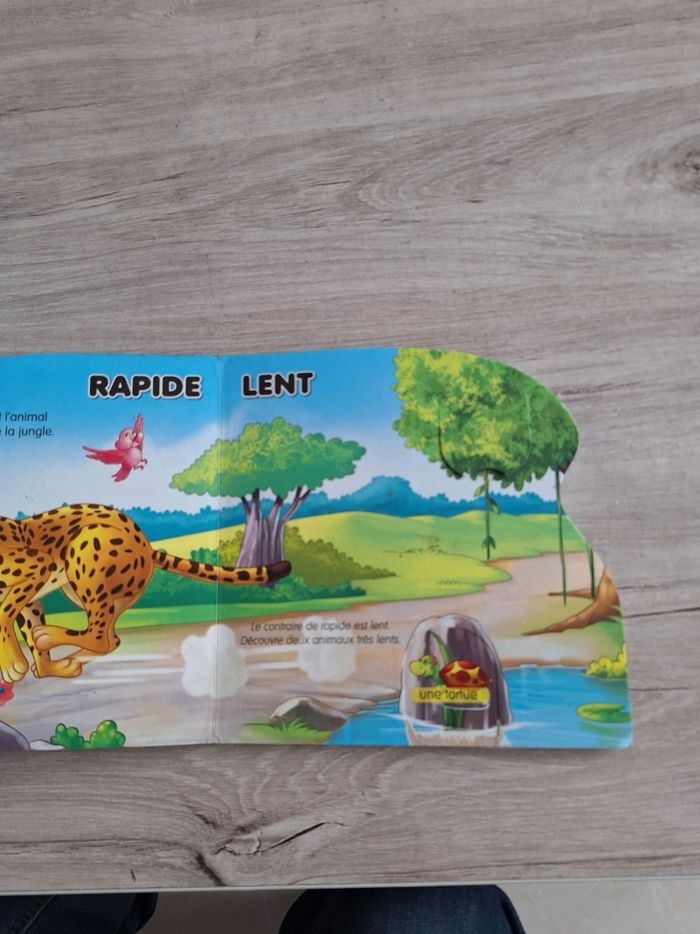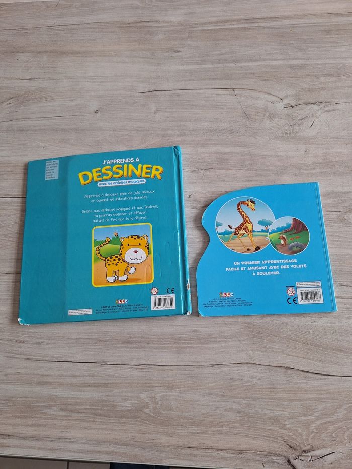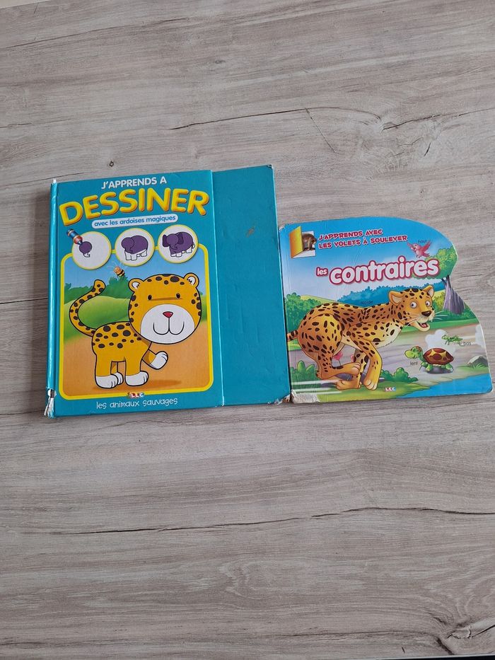 Un livre avec des volets à soulever. Sur une page un des volets est arraché. État correct car la couverture est abîmée sur les bords. Un livre ou on écrit avec un feutre à ardoise( le feutre n'est pas inclus) en état correct également car les coins de la couverture sont abîmés et la dernière page à des coups de crayons qui ne s'enlève pas.