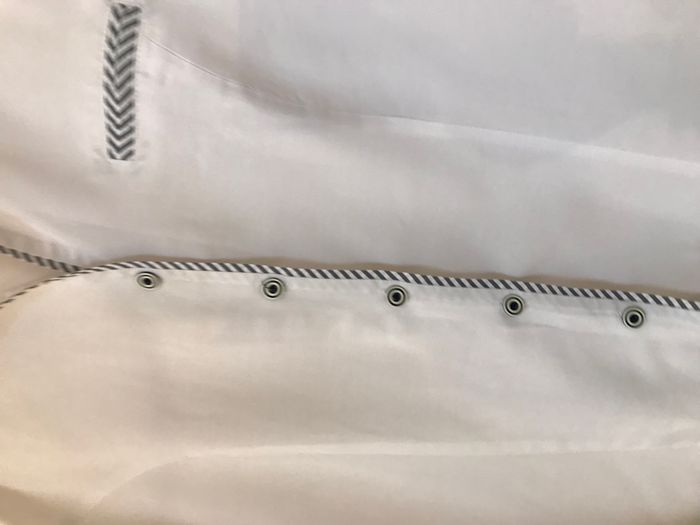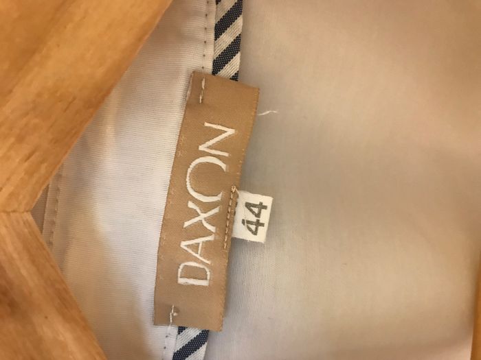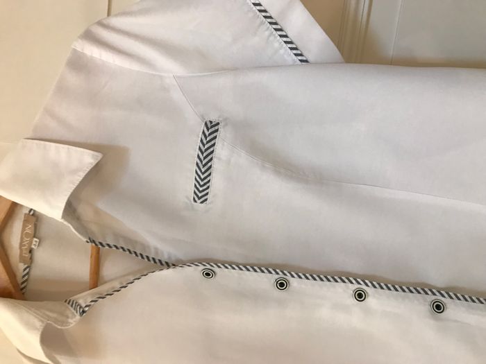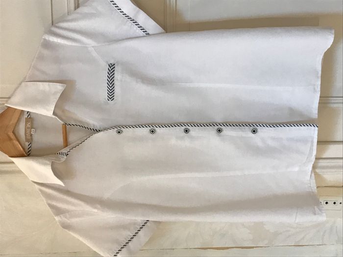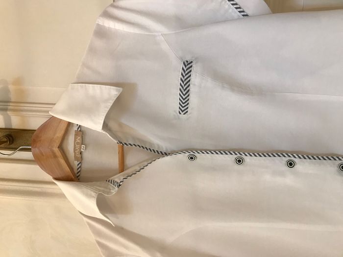 Chemisier blanc avec petit galon à rayures bleu jeans Composition : 65 % polyester et 35 % coton Bon état Taille : 44 (mais taille petit) Marque : DAXON