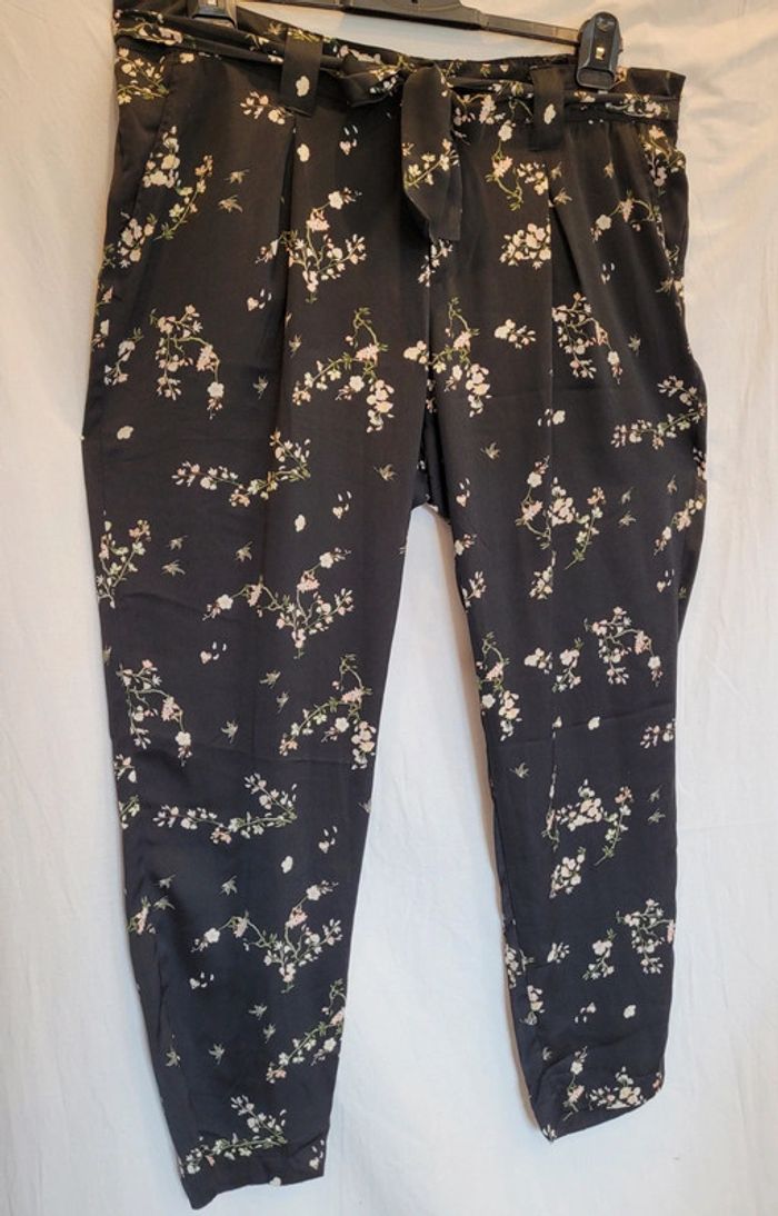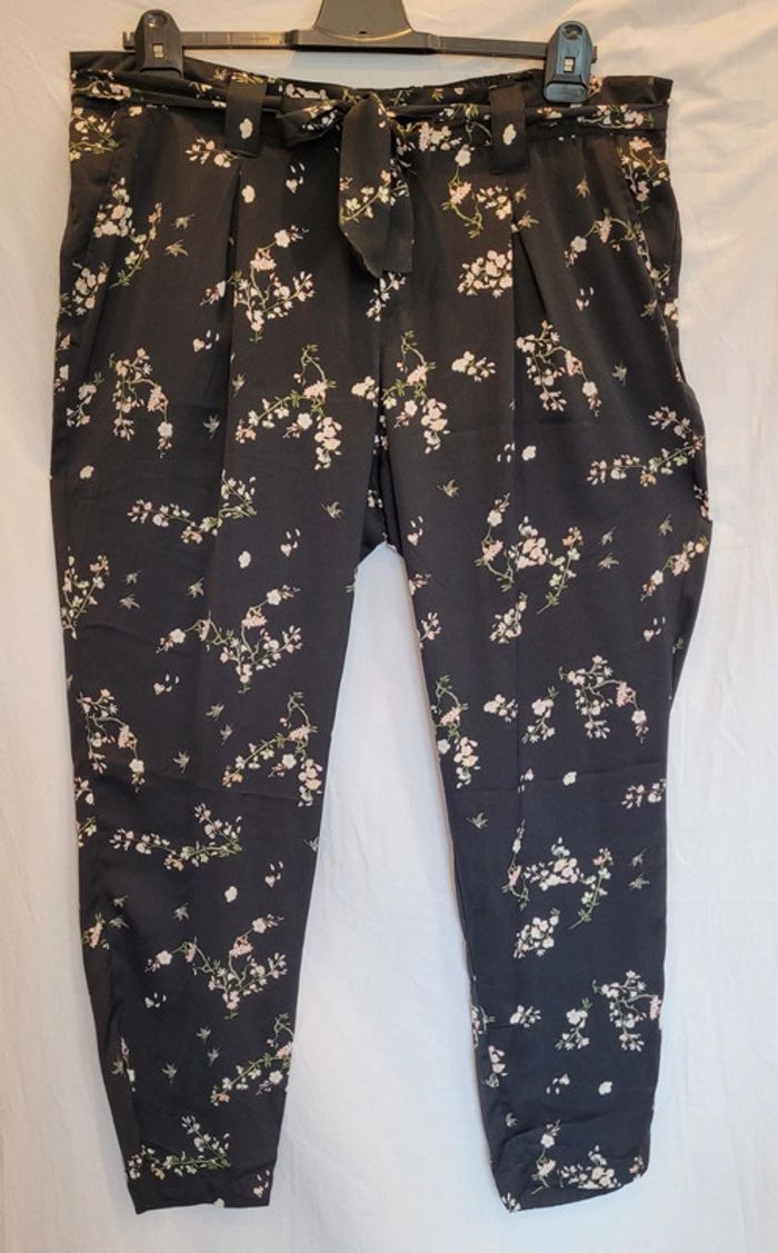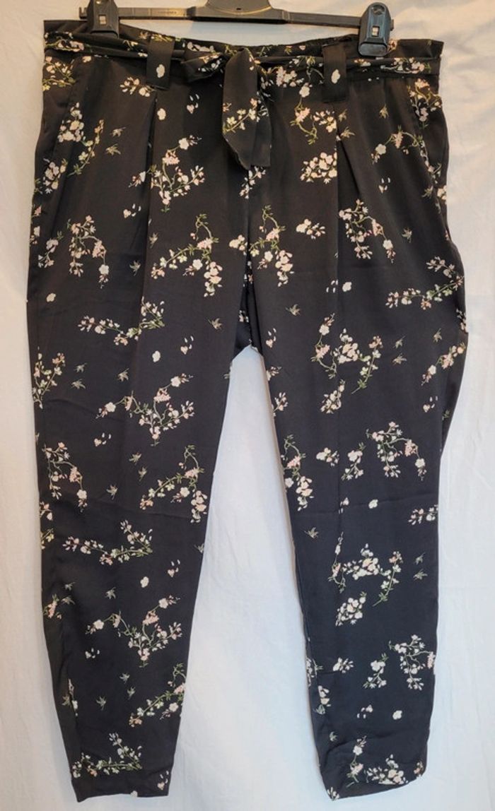 Bonjour Je vends ce beau pantalon léger très agréable à porter, aux motifs fleuris sympas. Ceinture assortie pour s adapter à votre morphologie. Vraies poches. Parfait état. Mesures Taille 53 + élastique au dos Hanches 72 Du haut au bas 108 avc un ourlet de 3cm qui peut être défait