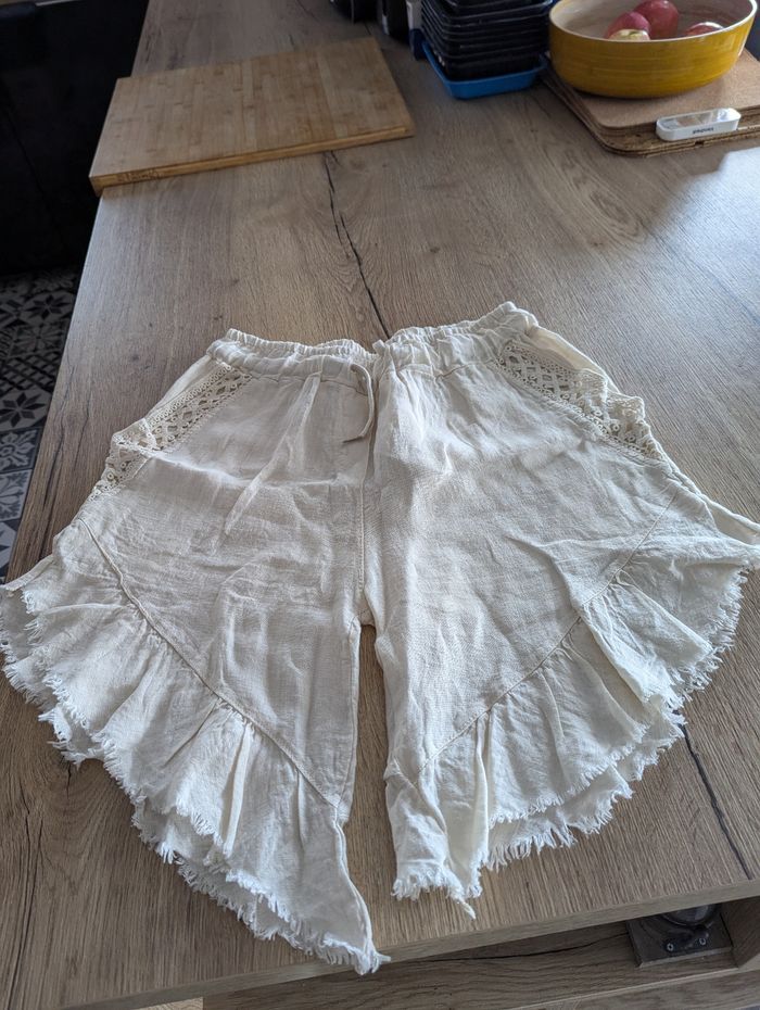 Short original en lin écru Taille élastique avec lien Base asymétrique 2 poches côté T B Etat Taille unique Prix: 10 euros