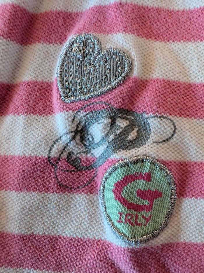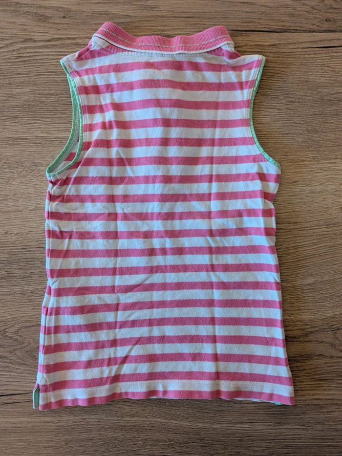 Joli débardeur sans manches de la marque Orchestra, taille 4 ans. Rayures roses et blanches pour un look estival. Col polo avec boutons pour une touche sport-chic. Petits détails brodés sur la poitrine. Matière légère et confortable, idéale pour l’été.
