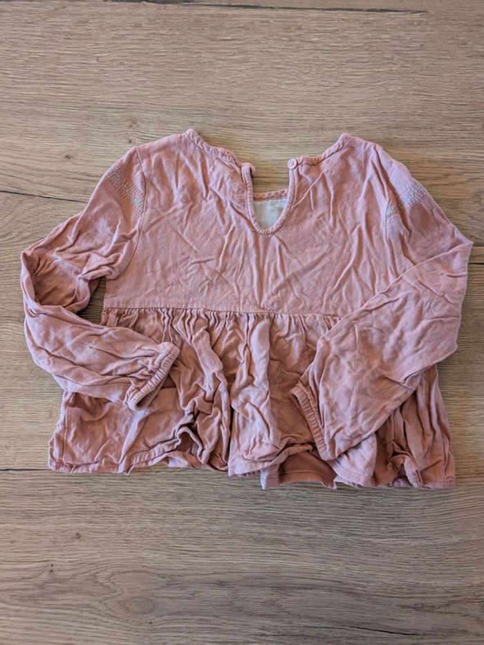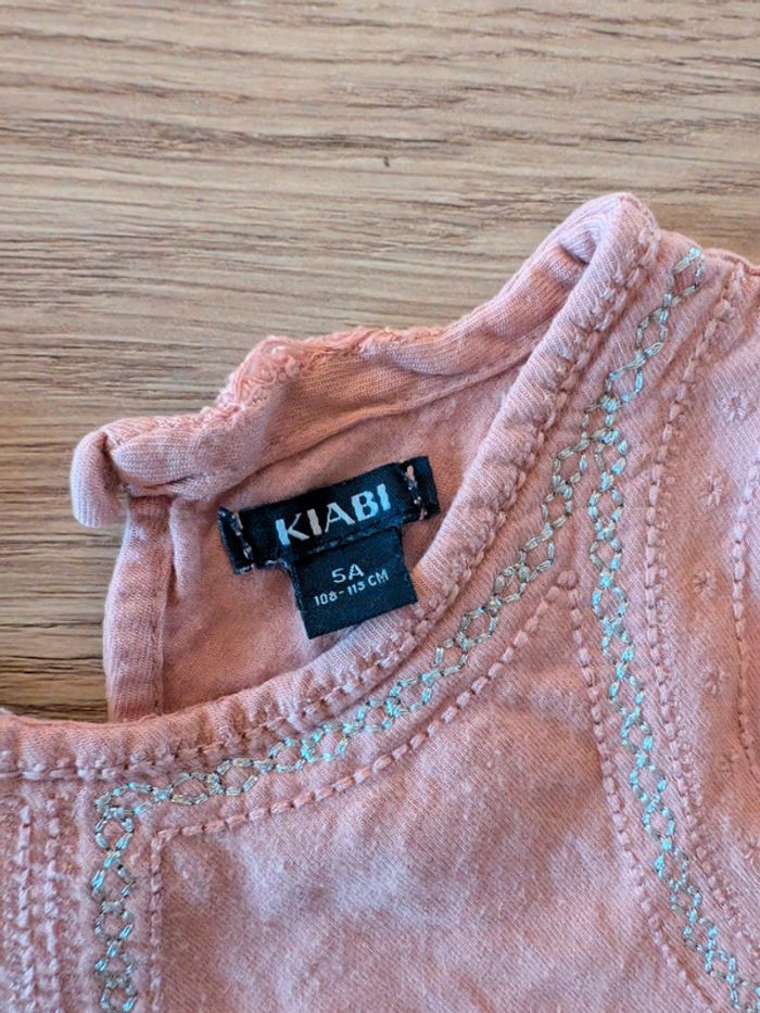 Jolie blouse rose en velours léger de la marque Kiabi, taille 5 ans. Matière douce et fluide, idéale pour la mi-saison. Détails brodés sur le devant. Manches longues avec poignets élastiques. Fermeture par un petit bouton au dos.