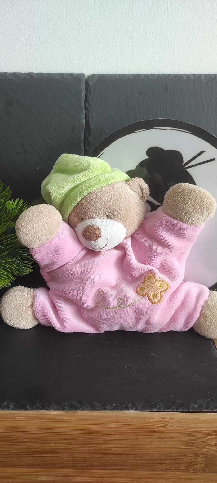 Doudou semi plat ours rose bonnet vert papillon Nattou Ancien Orange Grelot