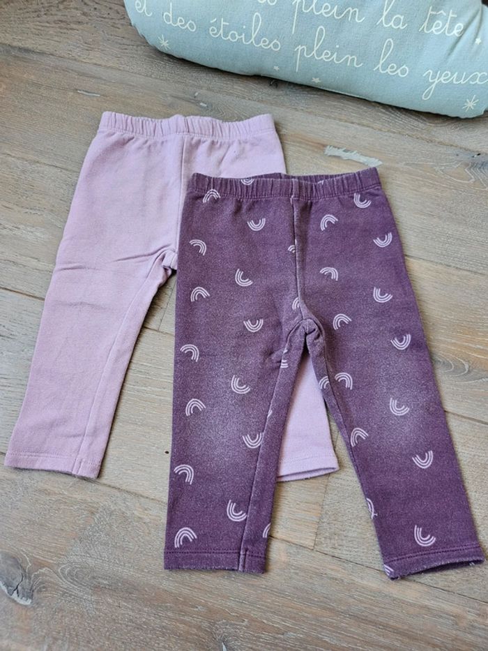 Lot de 2 leggings intérieur molletonné 12 mois. Très bon état pour le lila. Le violet à motif arc-en-ciel est un peu usé aux genoux. Pas de tâche, pas de trou. Créez un lot pour profiter des réductions 😉 #aurele776fille12mois #misaison #arcenciel
