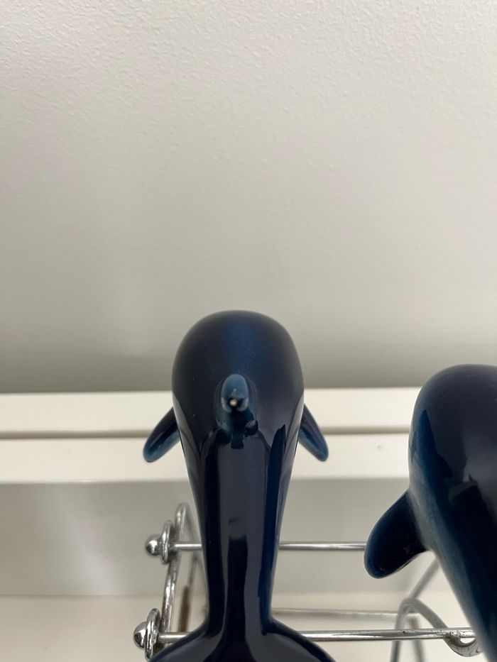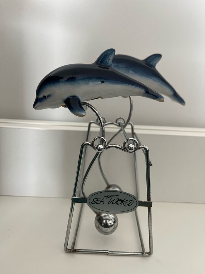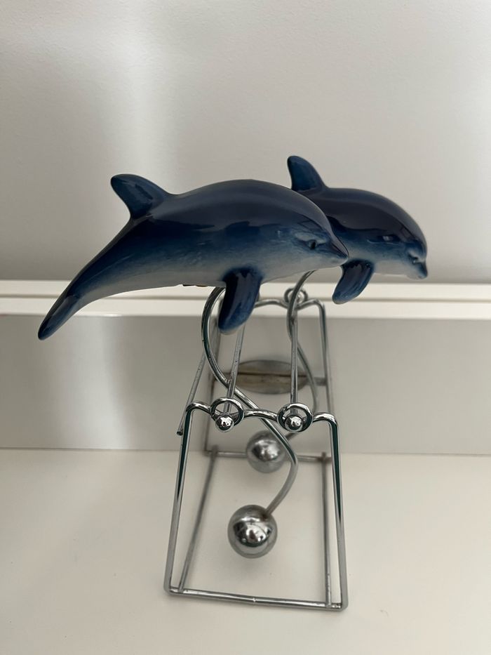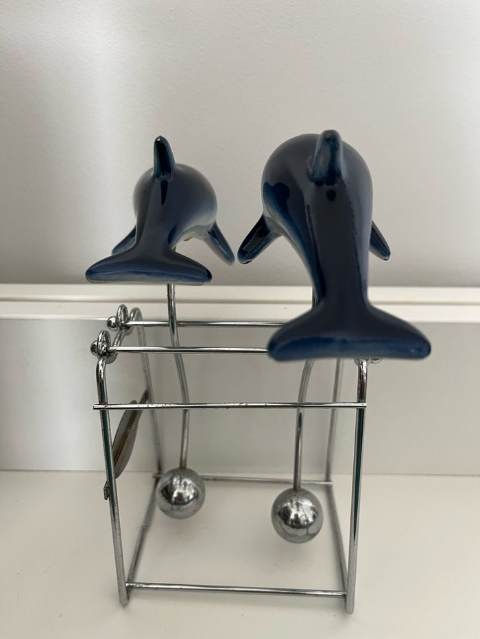 Bibelot dauphin sur balancier Il y a un petit éclat voir photo 4 Socle en fer Les dauphins sont fixé sur une tige avec une boule pour permettre le balancier. Dimension approximative : Hauteur : 18 cm Longueur : 14 cm Largeur : 9 cm