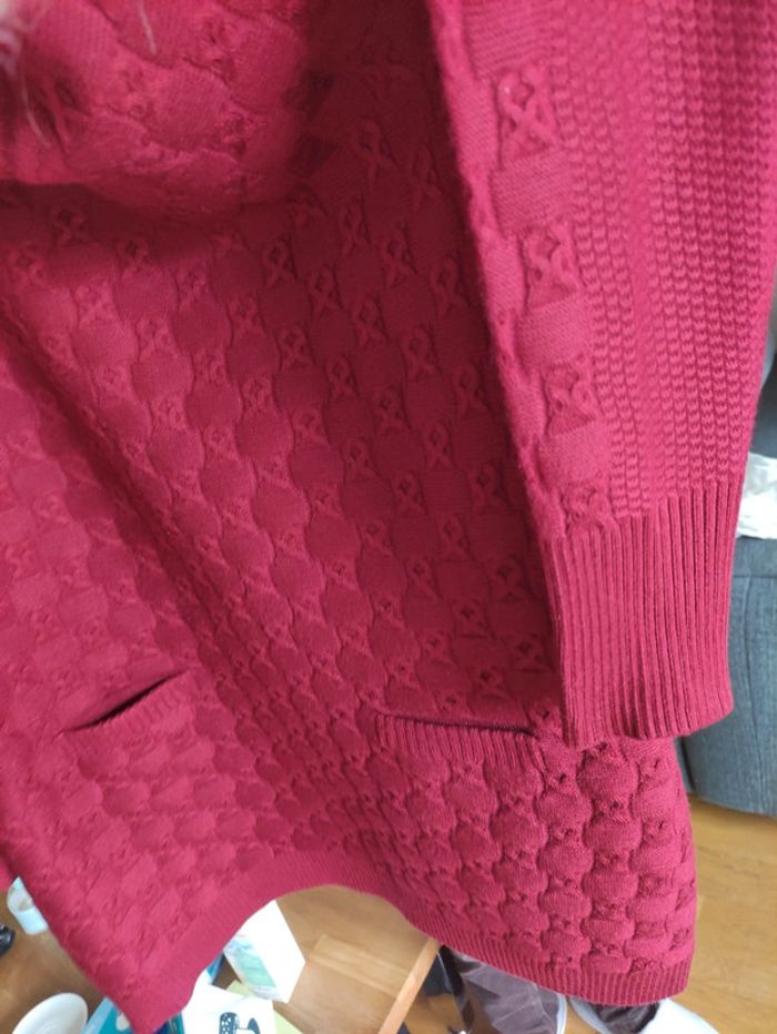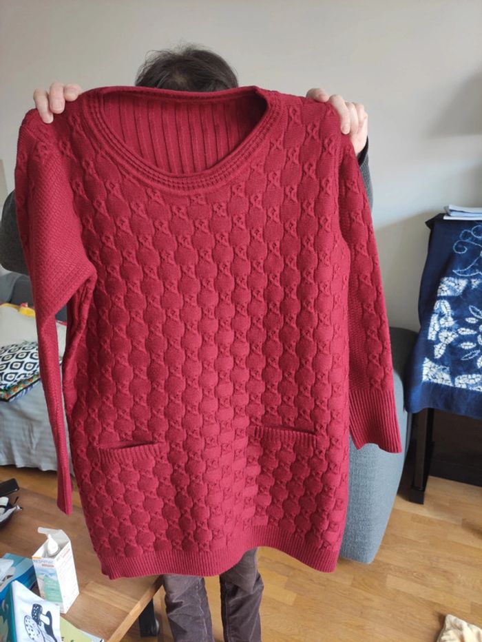 Pull belle couleur bordeaux jamais porté, 96cm tour de poitrine sans tirer, longueur 66cm, manche longueur 50cm. Deux poches plaquées devant. Belles motifs devant et sur les manches.