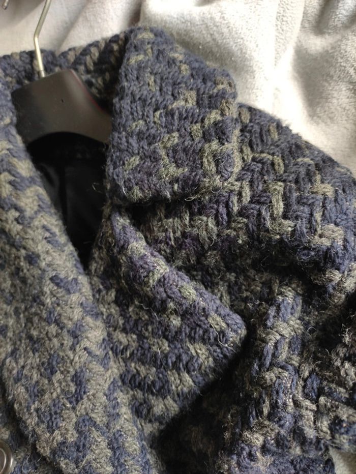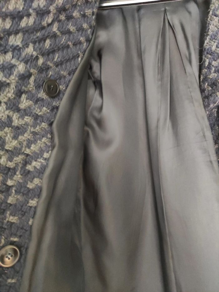 Manteau en très bon état 100% laine. Couleur bleue marine et kaki foncé. Coupe légèrement ample avec un pli au dos. Longueur au dessous des genoux pour moi (taille 1.62M). Pas de tâche ni problème de qualité, juste pour vider le dressing.