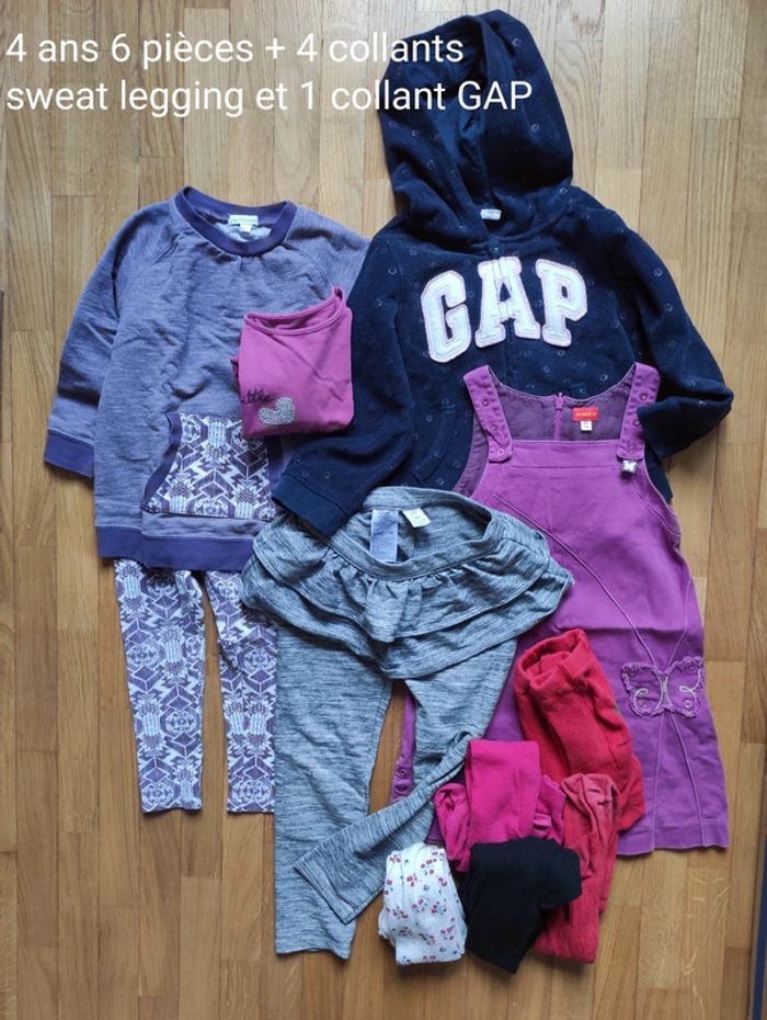 Dont 3 pièces GAP, l'ensemble sweat et legging Vertbaudet. Le legging avec jupette a un petit défaut sur un genoux. La robe et l'ensemble mauve sont très excellent état.
