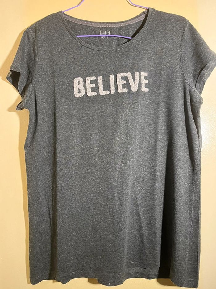 Tee-shirt gris chiné manches courtes. Inscription en perles blanches « believe ». Tee-shirt pas déformé , pas tâché ni troué .