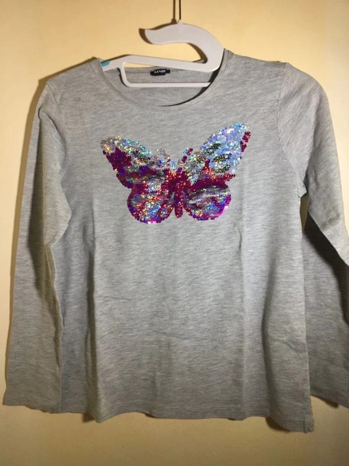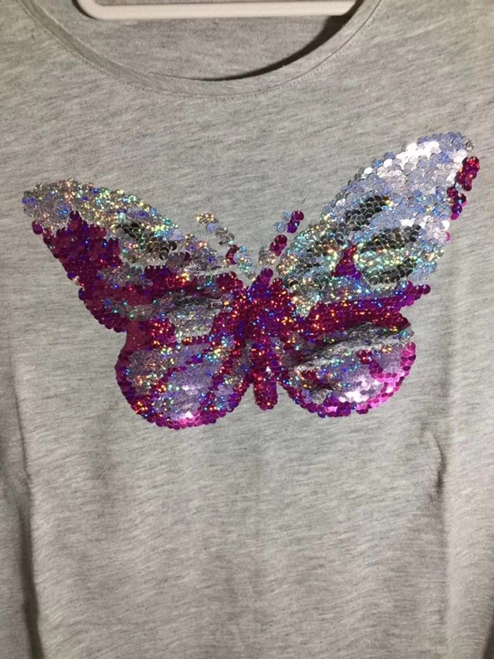 t-shirt gris clair. manches longues. motif papillon brillant en sequins. très bon état aucunes tâches, ni trous, ni marques d’usures