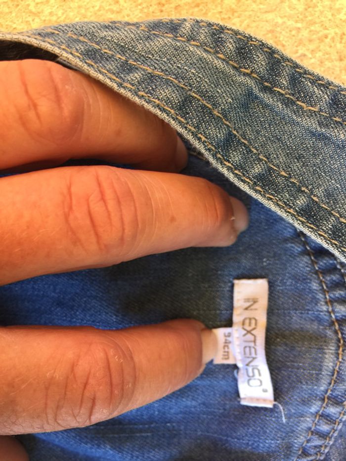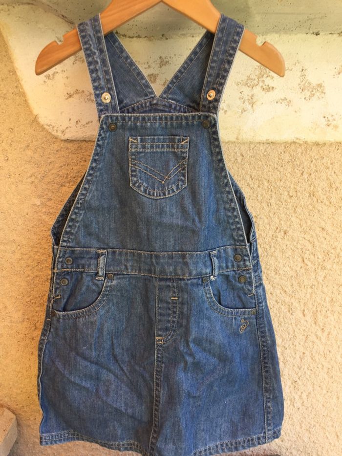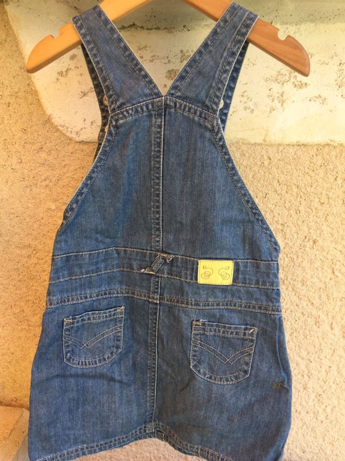 robe en jean bleu ciel taille 3 ans . boutonnage des deux côtés par pression. bretelles réglables. ni tâches ni marque d usures