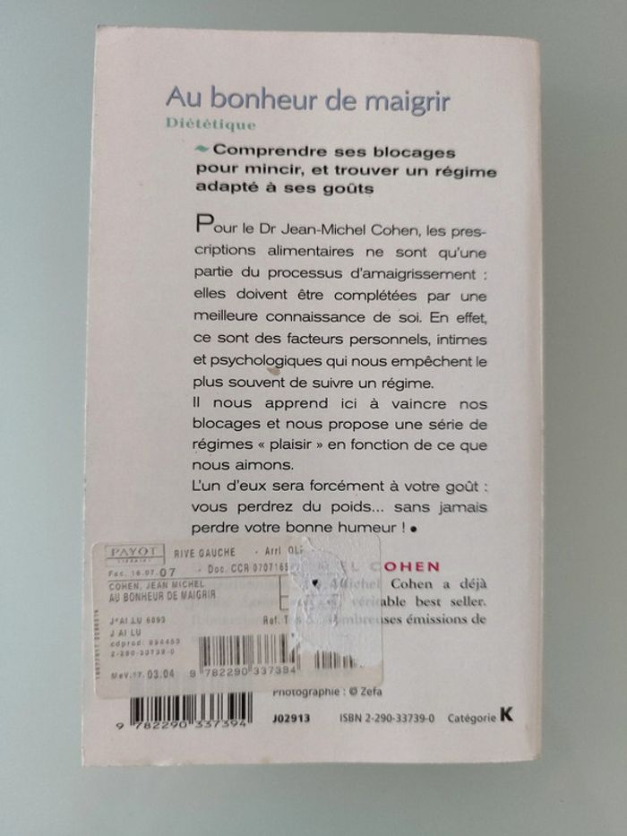 Pour le Dr Jean-Michel Cohen, les prescriptions alimentaires ne sont qu'une parte du processus d'amaigrissement elles doivent être complétées par une meilleure connaissance de soi. En effet, ce sont des facteurs personnels, intimes et psychologiques qui nous empêchent le plus souvent de suivre un régime. Il nous apprend ici à vaincre nos blocages et nous propose une série de régimes " plaisir " en fonction de ce que nous aimons. L'un d'eux sera forcément à votre goût vous perdrez du poids... sans jamais perdre votre bonne humeur ! #adv28_livres