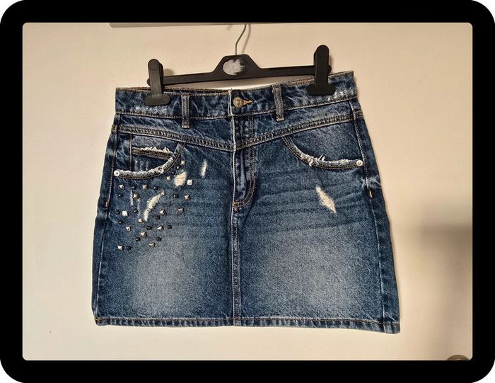 Jupe pimkie en jean avec "clous" sur la poche de droite taille 36 dimensions et composition sur les photos ⚠️ N’hésitez pas à faire un tour sur mon dressing, je fais le tri et les réductions sur les lots sont activées ⚠️ #flore37_femme_tailleS #pimkie #pimkie36 #pimkiefemme