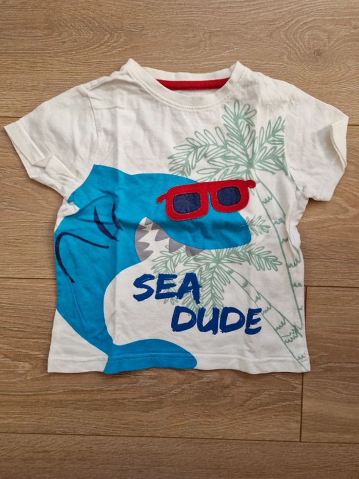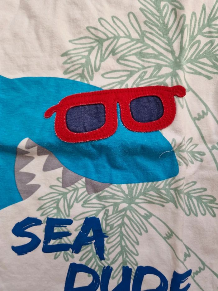 Tee-shirt avec dessin de requins et palmiers, lunettes de soleil en tissu et inscription sea dude #sarahzajacgarcon36m #szcarde