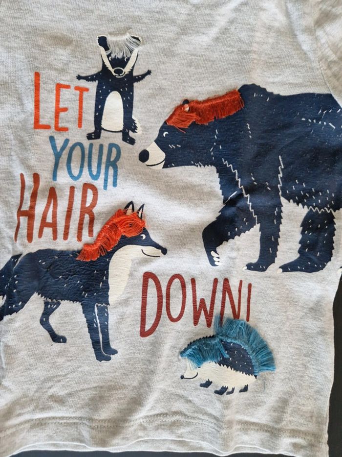 Tee-shirt avec dessins d'animaux avec des cheveux cousus pour jouer avec. Il y a in ours, un loup, un hérisson... #szcarde #sarahzajacgarcon36m