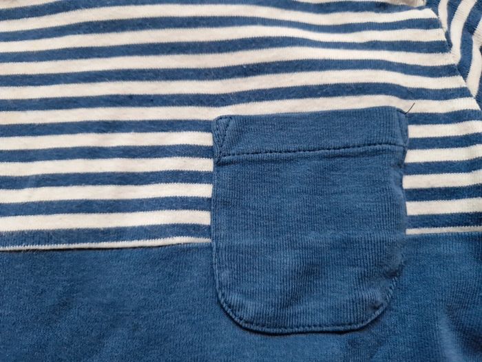 Pull chaud pour l'hiver avec bouton sur l'épaule, motif ligné bleu blanc sur le haut, poche sur le cœur et protège coude. #sarahzajacgarcon18m #szbebe #sz18m #szcarde