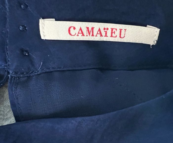 Marque "Camaieu", Robe de cérémonie, de soirée ou de fêtes. matière fluide satinée, entièrement doublée. Col haut fermé au dos par 3 boutons, empiècements tulle aux épaules. Tour de poitrine 98 cm, longueur 93 cm.