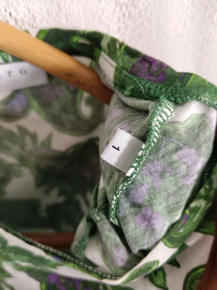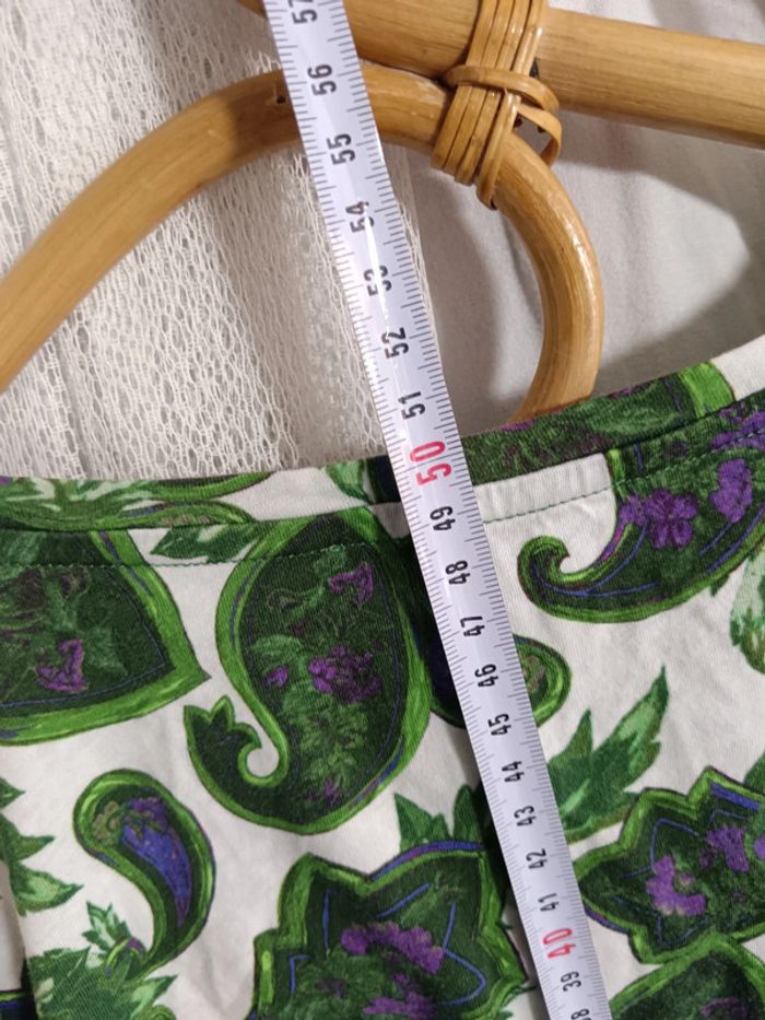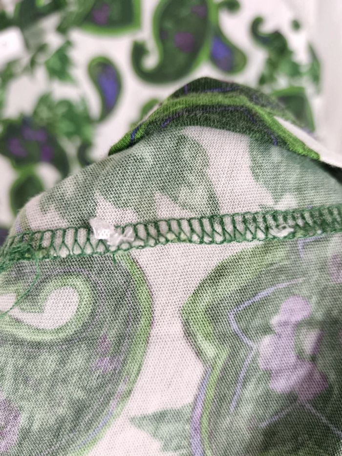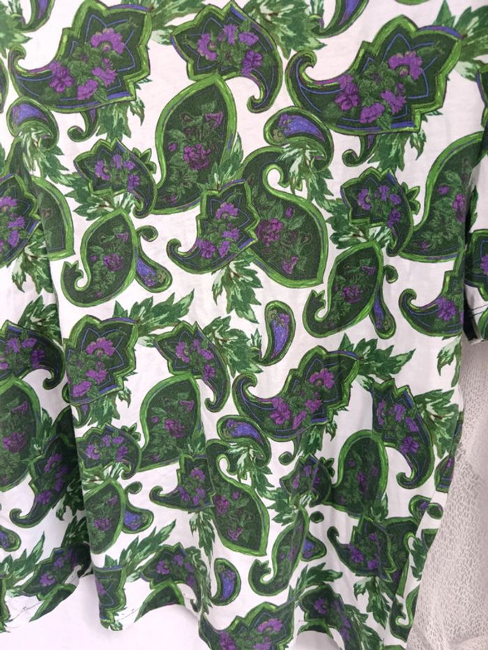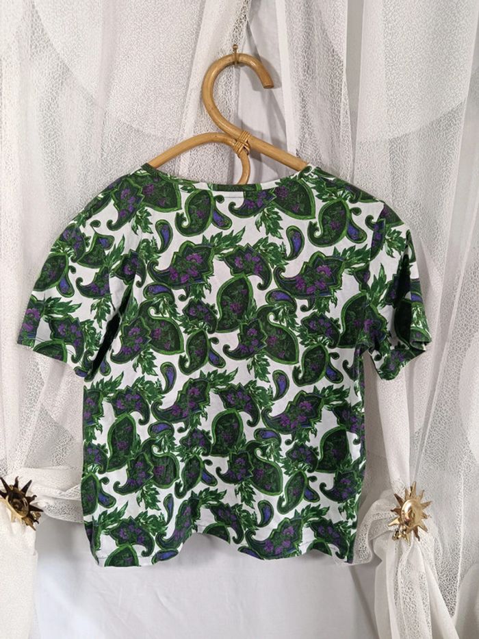 Tee-shirt Sandro taille 1. Motif paisley vert et violet. Étiquette compo coupé mais modèle connu : en coton. Excellent état. #calm36 #teeshirtpaisley #teeshirtsandro