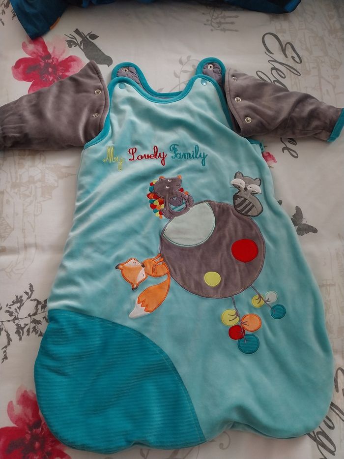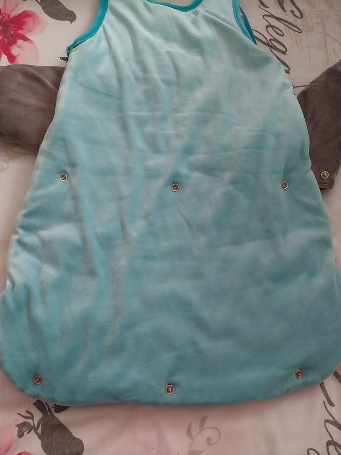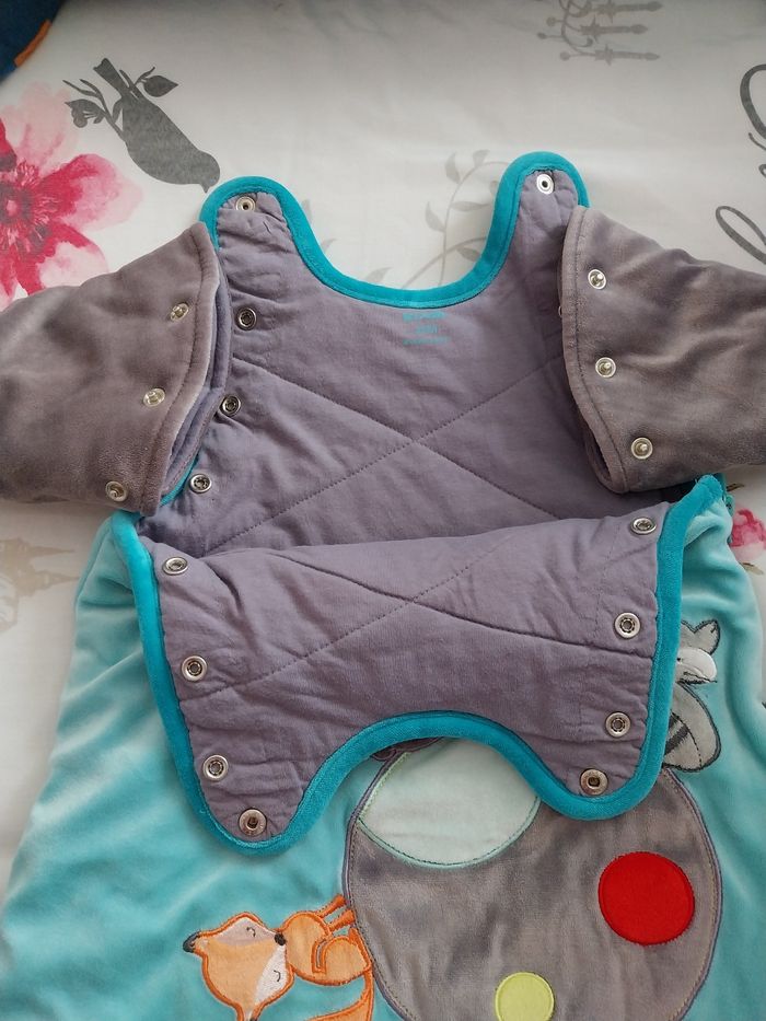 Gigoteuse 0-6 mois en parfait état, manches amovibles et pressions derrière pour réduire la longueur , très douche et chaude.