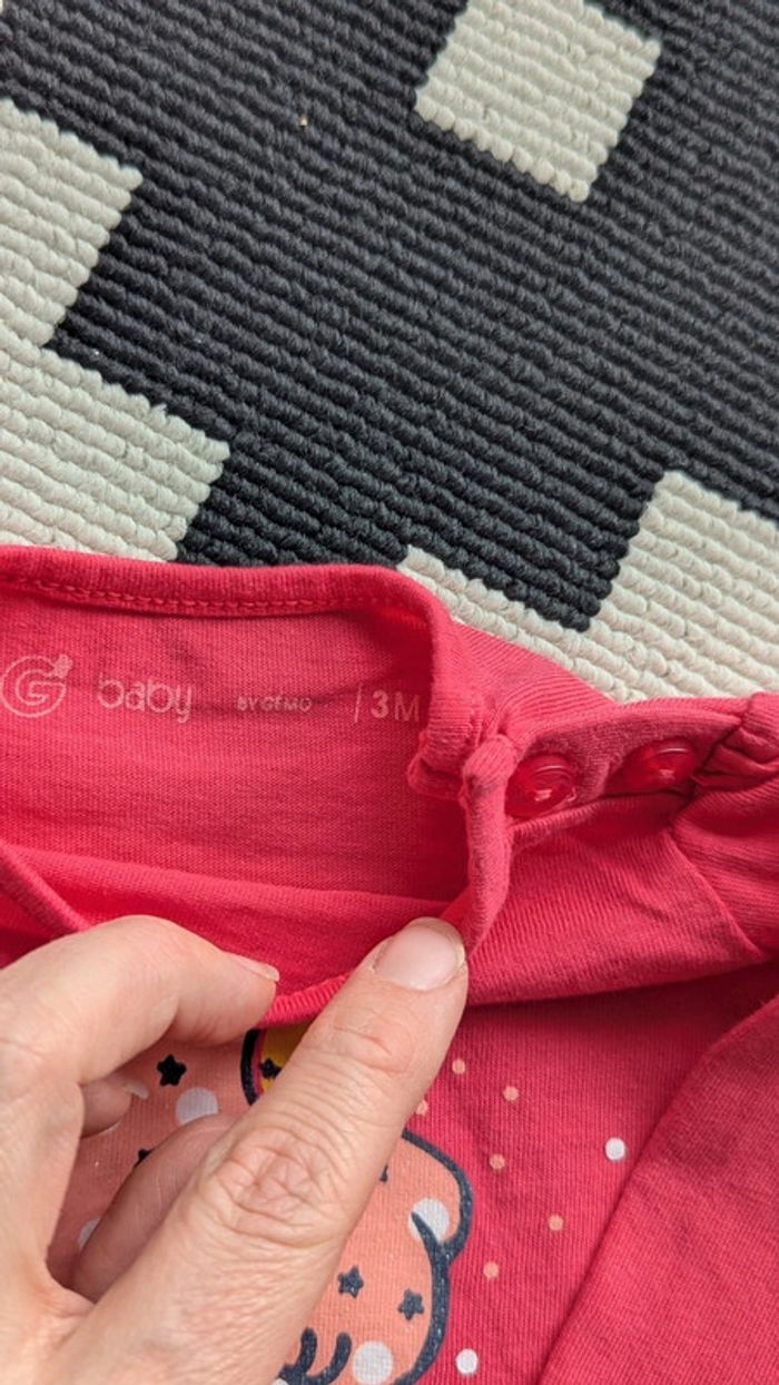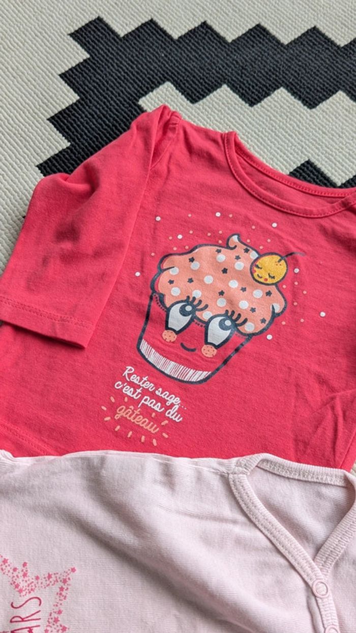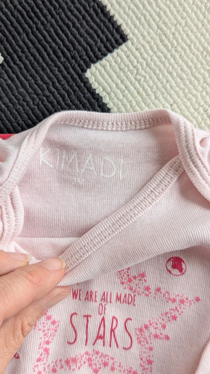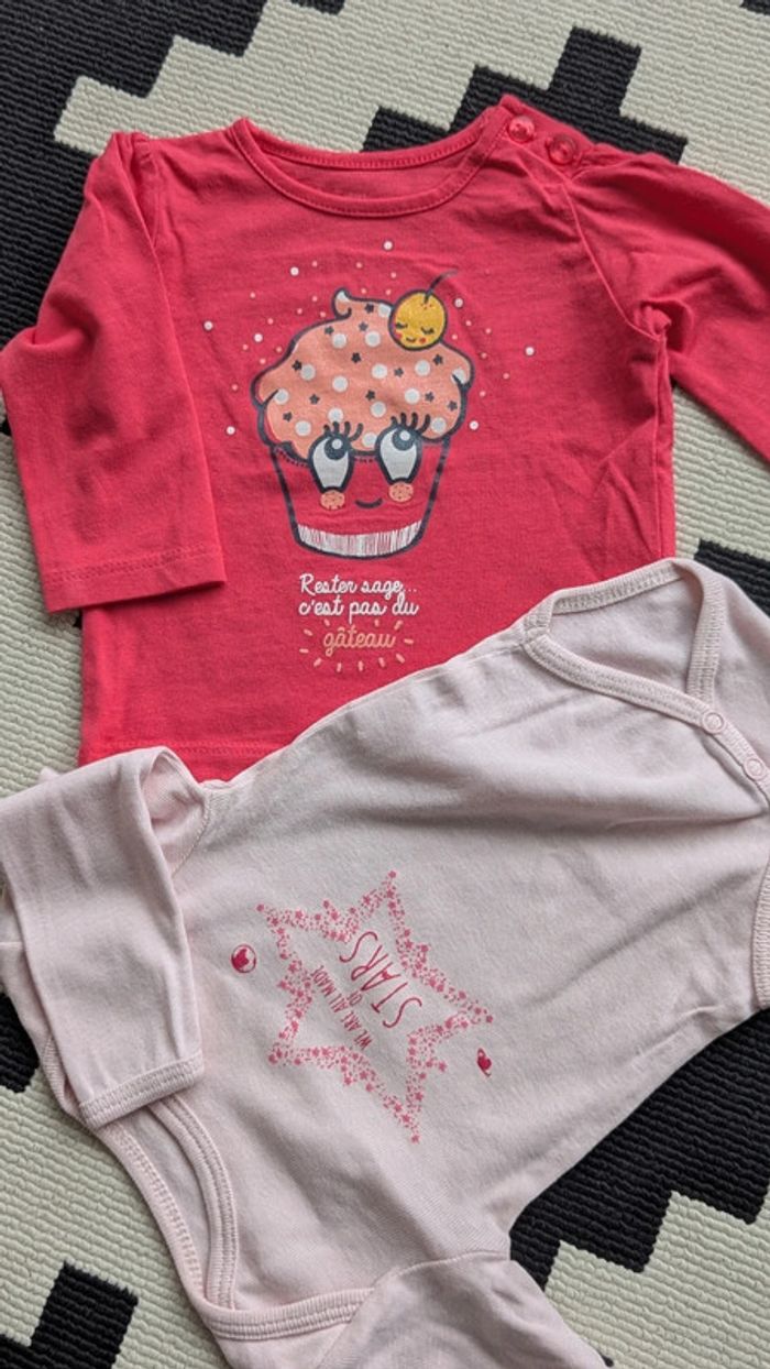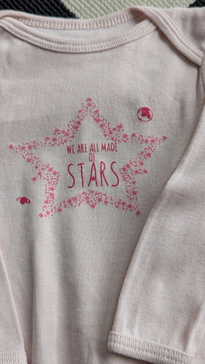 #emychou_3mois Un body 3 mois rose clair "we are all made of stars" avec une grande étoile Un t-shirt à manches longues Gémo 3mois avec un gâteau "rester sage c'est pas du gâteau" , 2 boutons à l'épaule Maison non fumeur