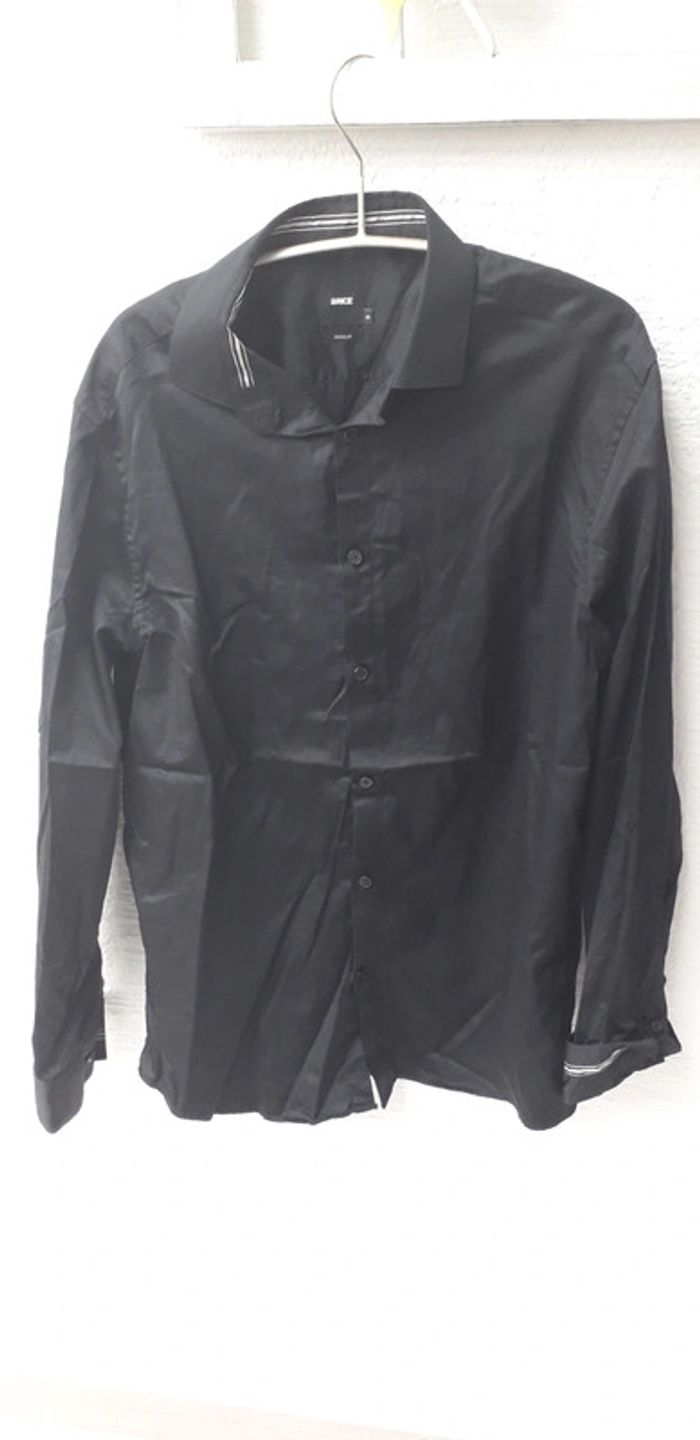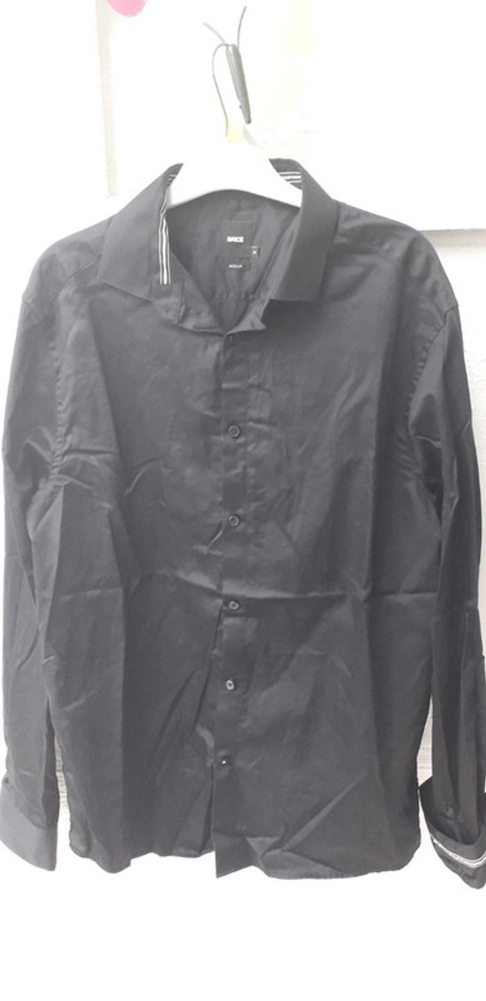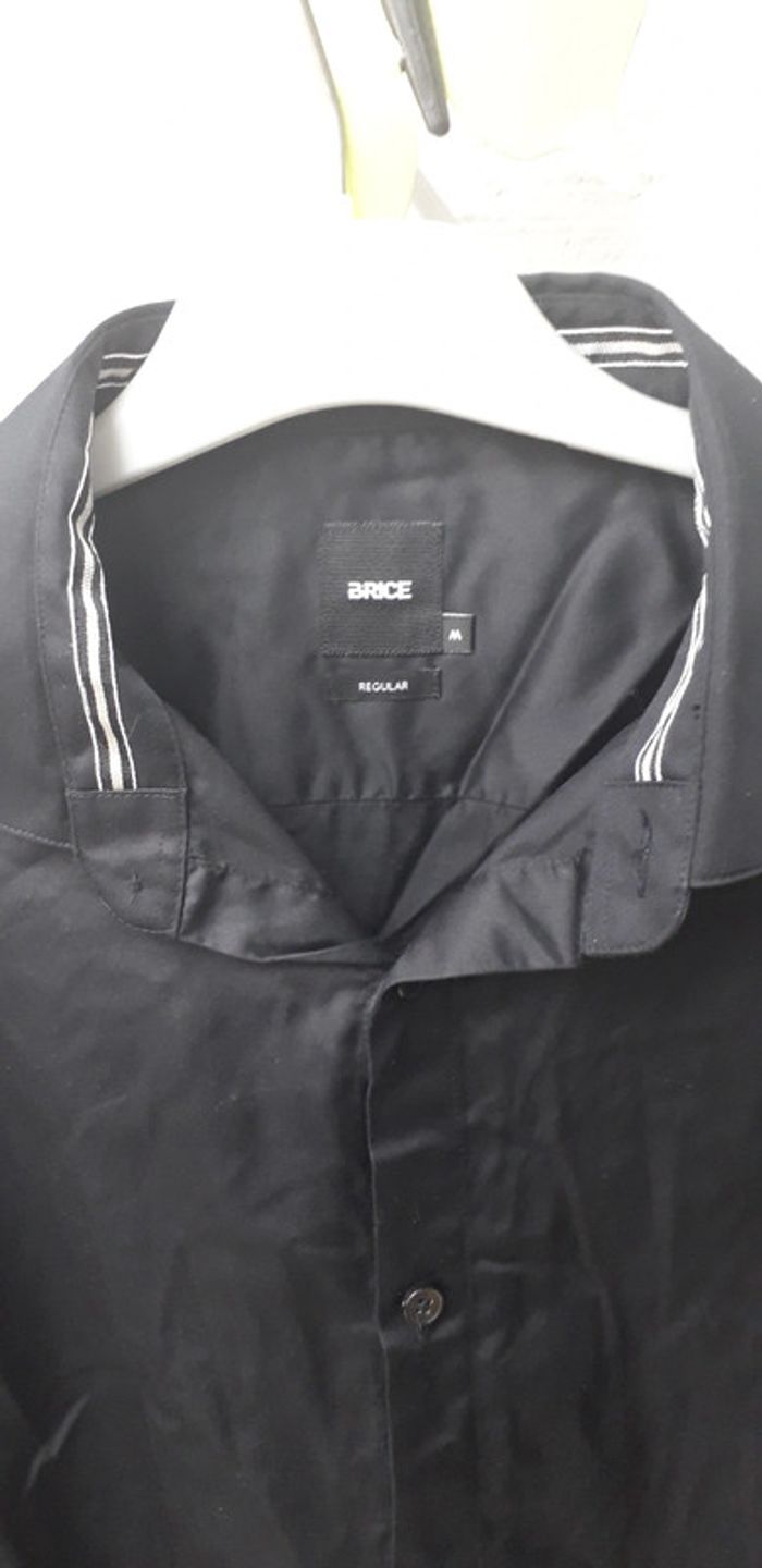 Chemise de la marque Brice forme Regular taille M matière 100 % coton, coloris noir liseret blanc au niveau du col et de la Manche intérieur, hauteur environ 73, largeur épaule à épaule environ 43 cm.