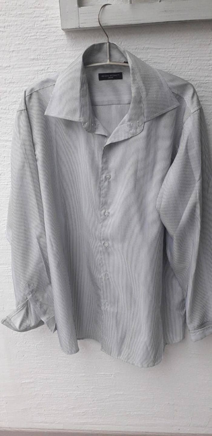 Chemise  de la marque Adriano Giacometti manches longues, taille 41/42 matière 100 % polyester, coloris blanc avec des rayures noires, largeur épaule à épaule environ 46 cm, hauteur de la chemise environ 78 cm.