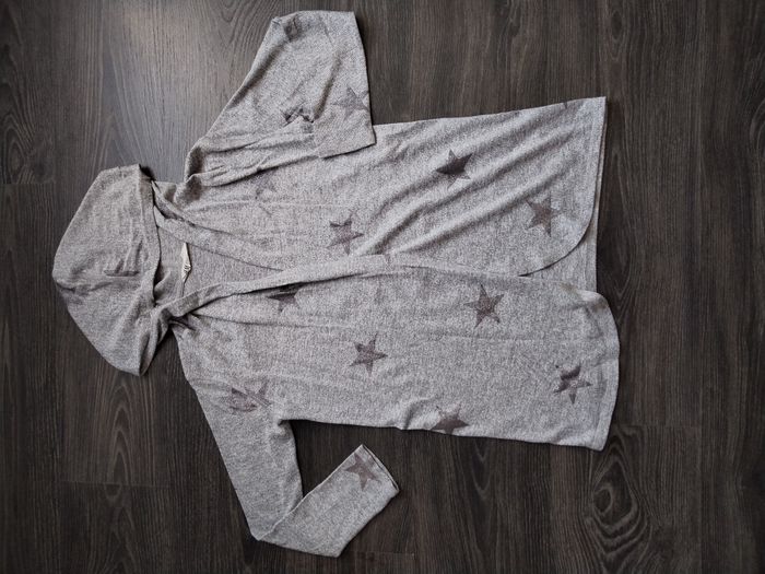 Joli gilet à capuche, gris clair avec étoiles pailletées. Sans fermeture, fin et souple. Très bon état 12 ans H&M