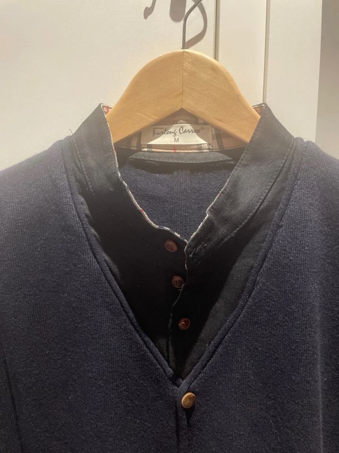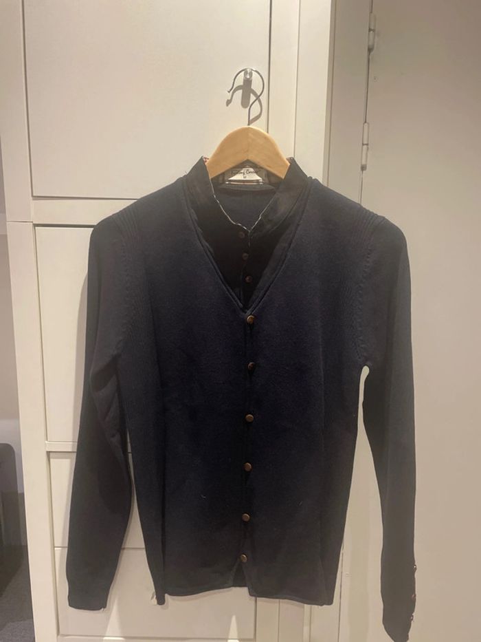 Pull bleu col en V avec effet fausse chemise. Faux bouton tout du long. Faux bouton aux manches