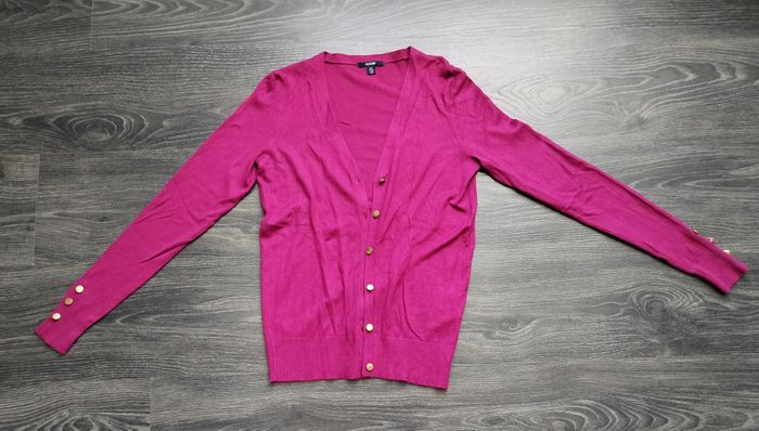 Beau gilet mailles fines, rose framboise, avec boutons dorés pour fermeture et sur le bas des manches. Parfait état, peu porté. XS 34 Kiabi