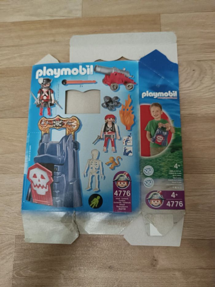 Accessoires présents sauf une petite pièce noire qui se fixe sur la cape du pirate dans le dos Squelette phosphorescent Pas de notice Boite disponible (dépliée) Autres lots playmobil pirates disponibles Remise sur Guer