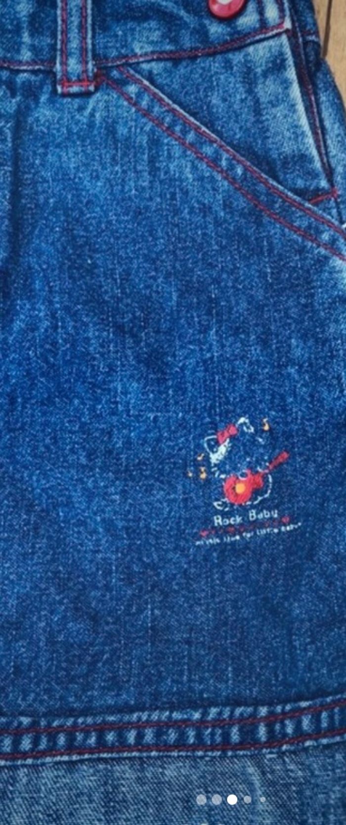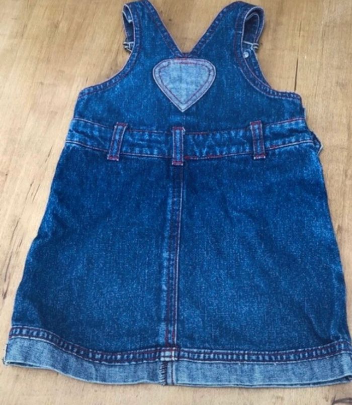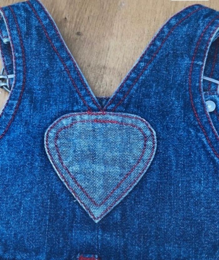 Robe en jean bleu avec couture rouge , Bouton rouge +petit cœur à l intérieur du bouton