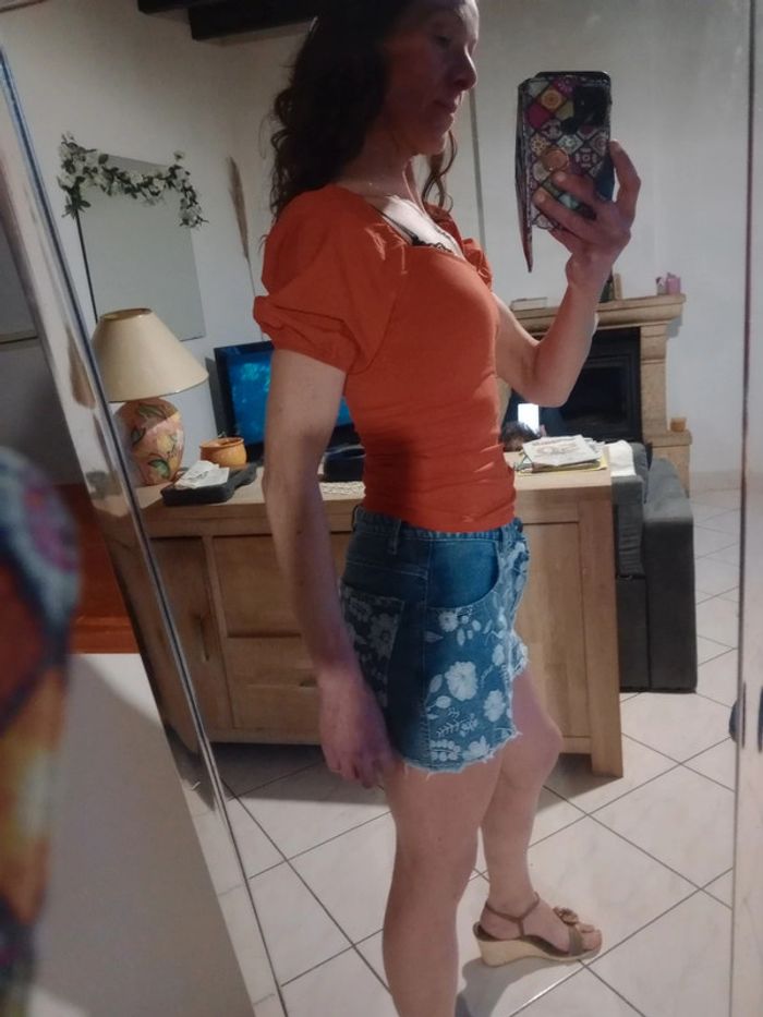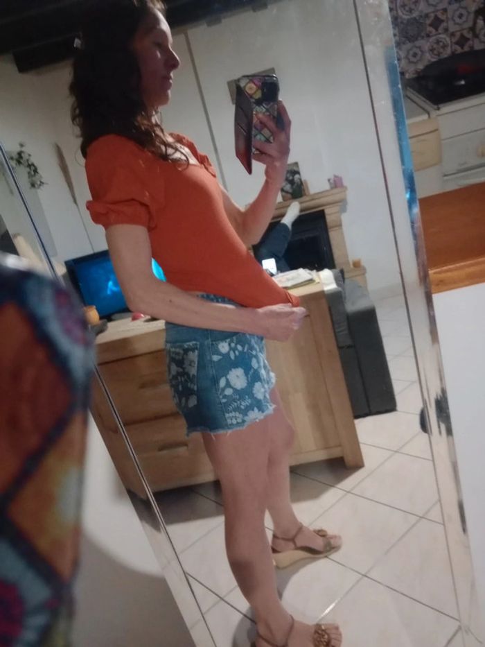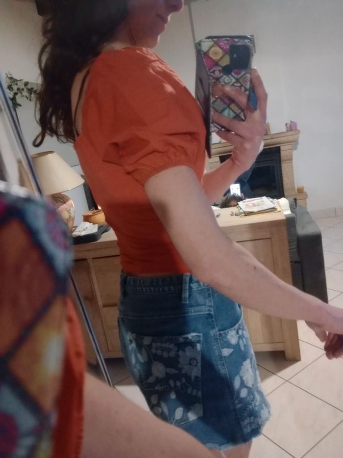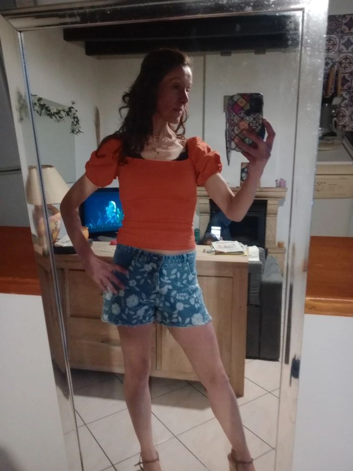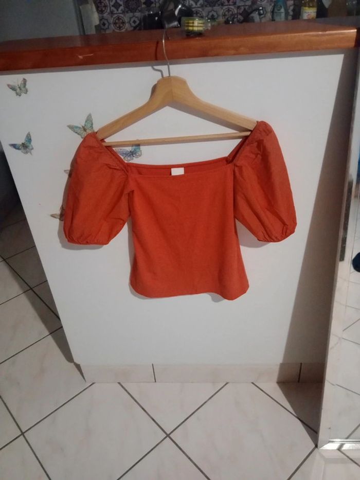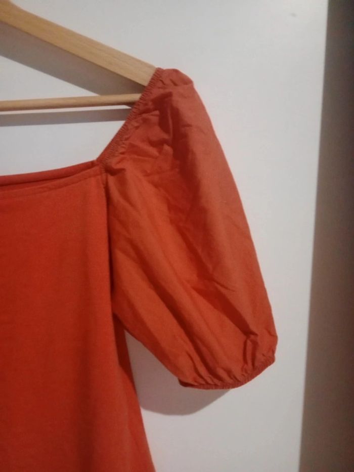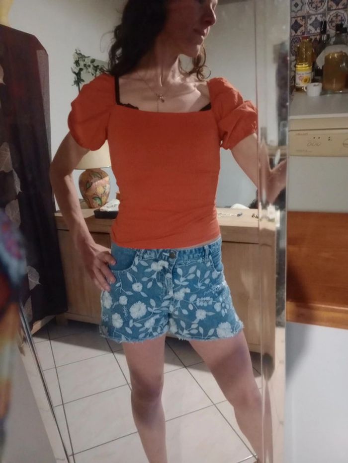 Joli top d'été aux manches bouffantes Ce top est composé de deux matières : la partie buste est élastique contient de l'élasthanne et viscose tandis que l'autre partie est d'une autre matière Longueur 47 cm épaule à épaule 36 cm aisselle 37 cm #carineleray_femme_34