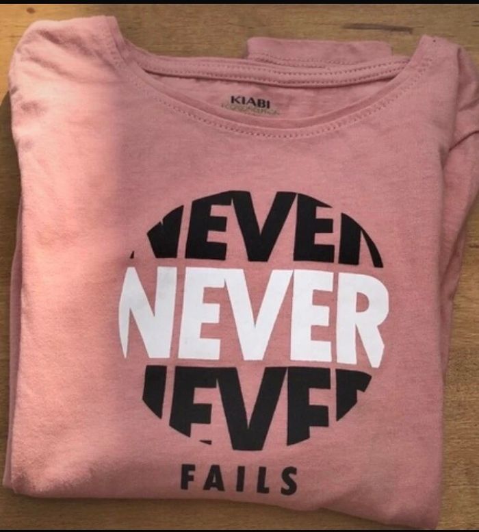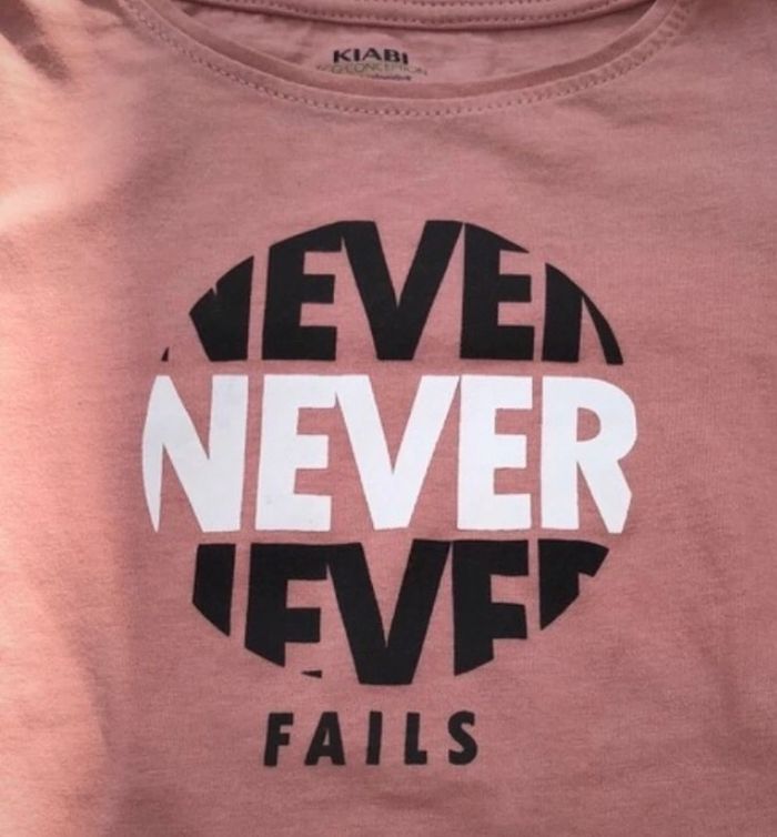 Tee shirt manche longue rose saumon avec motif noir et blanc « NEVER FAILS »