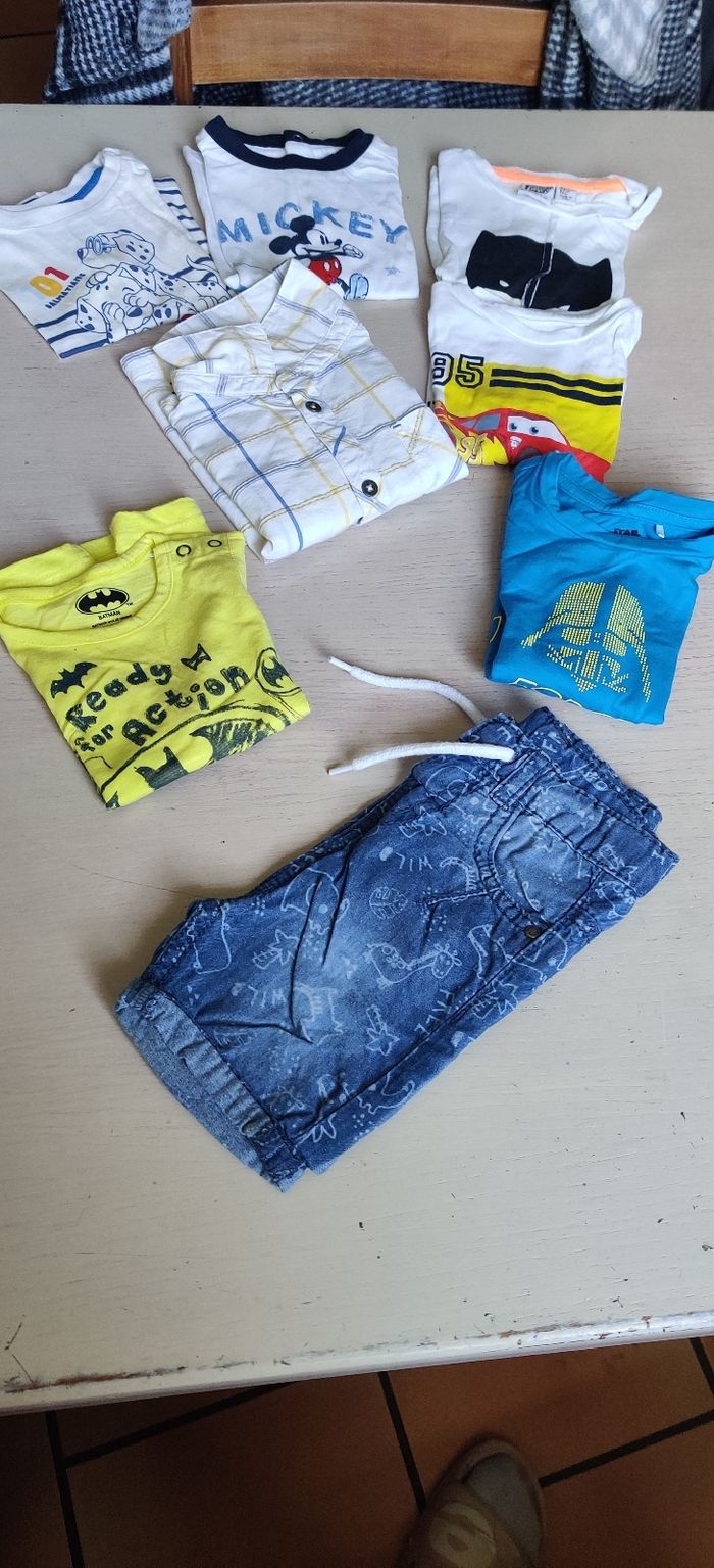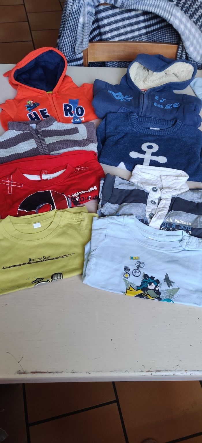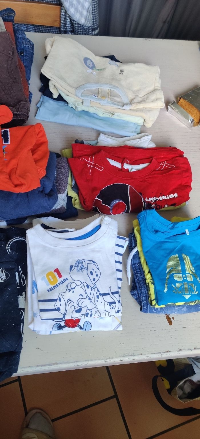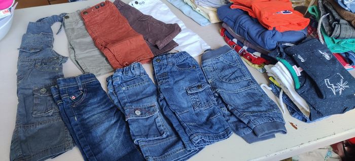Lot comprenant 8 pantalons, une salopette, 4 gilets, 4 t-shirt manche longue, un pull, un ensemble jogging, 2 bodies, 4 pyjamas, un short, une chemise manche courte, une chemise manches longues 2 débardeurs, 4 t-shirt. Le tout pour 25€