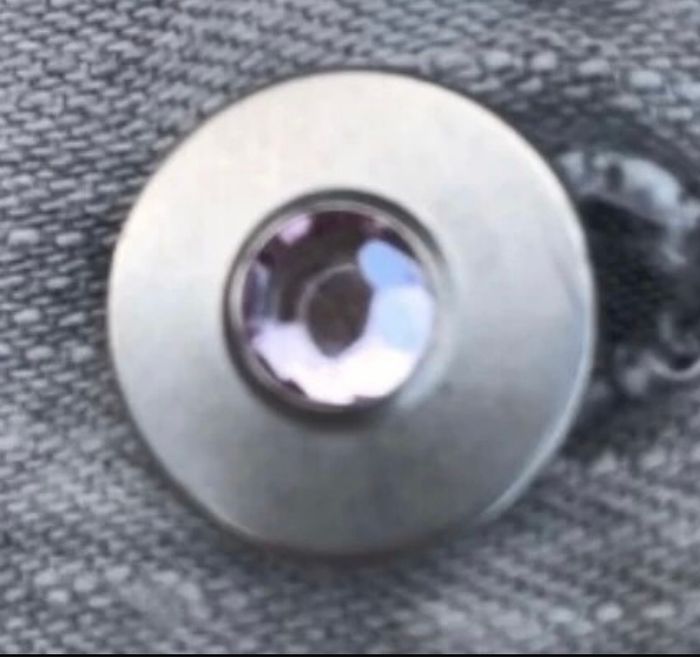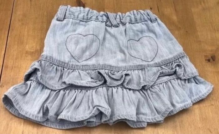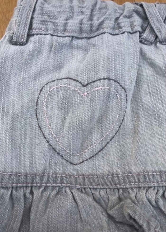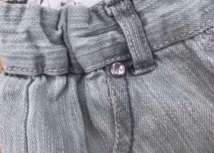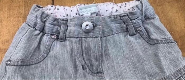 Jupe en jean grise avec les coutures rose clair à l arrière de la jupe. Devant de la jupe boutons effet diamant rose. Réglable à la taille