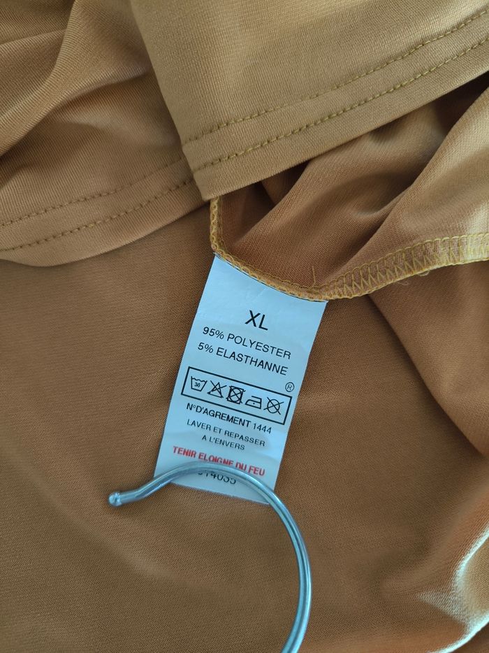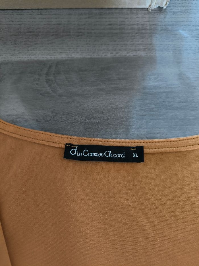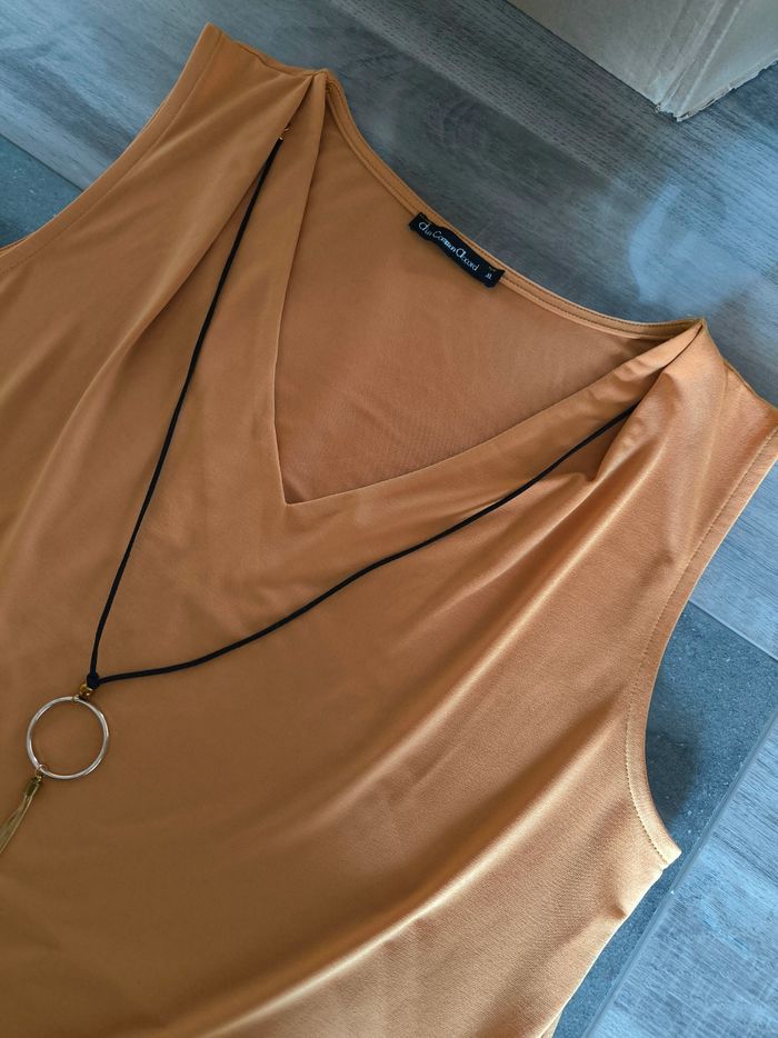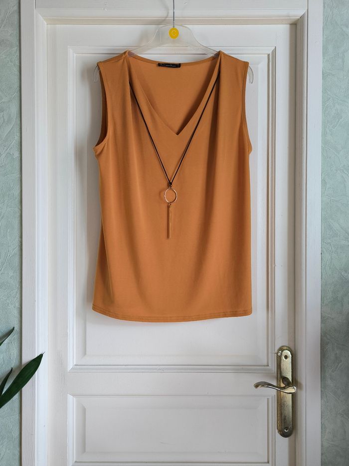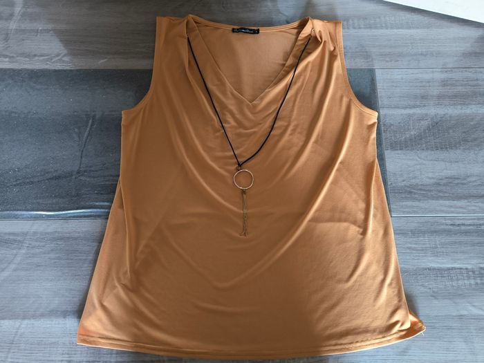 Débardeur / Blouse sans manches Marque D'un commun accord Taille XL, 42 • Coloris moutarde • Col V • Collier intégré • Tissu fin, stretch Largeur aisselle à aisselle non étirée : 53 cm Largeur aisselle à aisselle étirée au maximum : 84 cm Longueur totale : 67 cm Longueur aisselle : 44 cm En très bon état proche du neuf #evelyne_taille_42