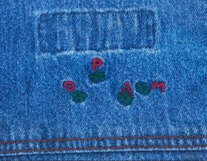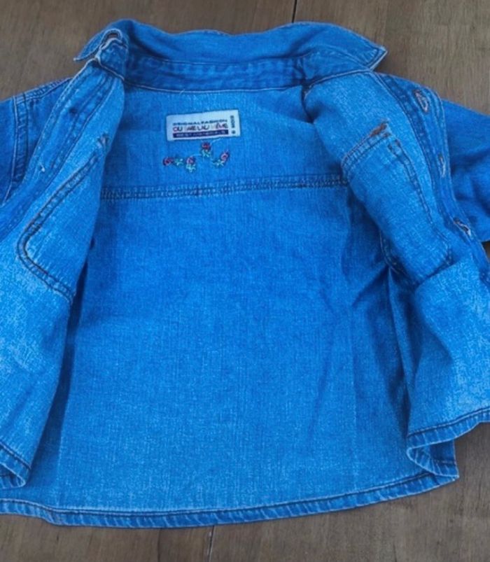 Chemise en jean bleu à boutonnière Boutons de couleur blanc à l intérieur « voir photo » Dans le dos petit motif rouge /vert