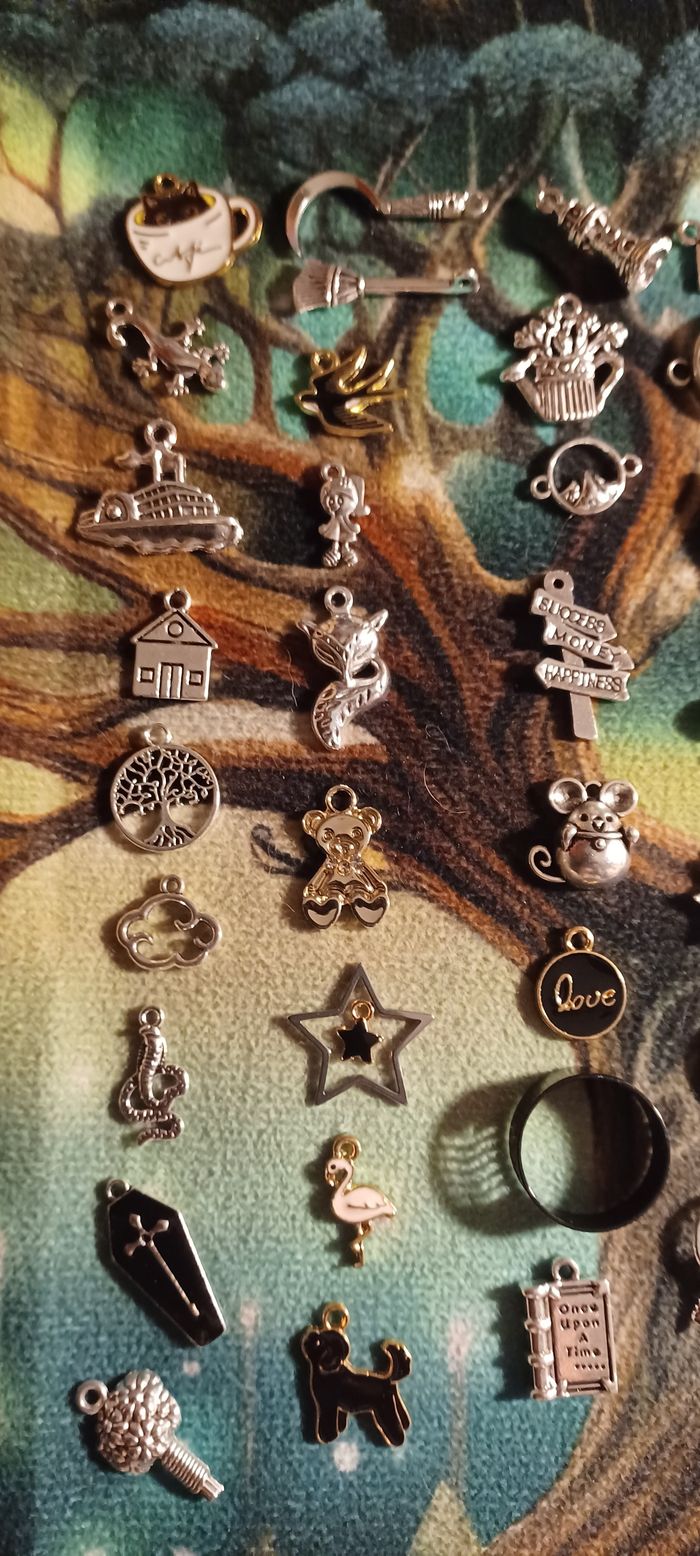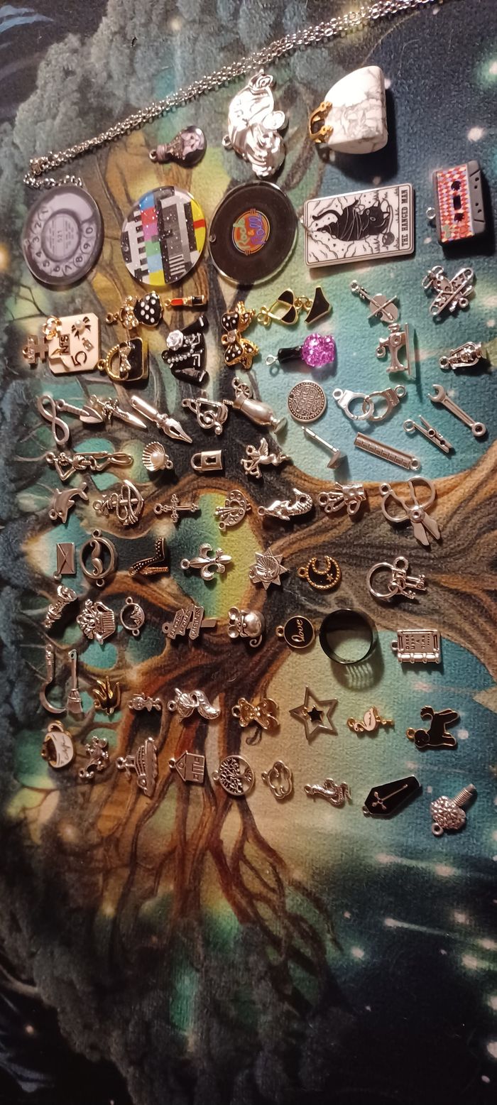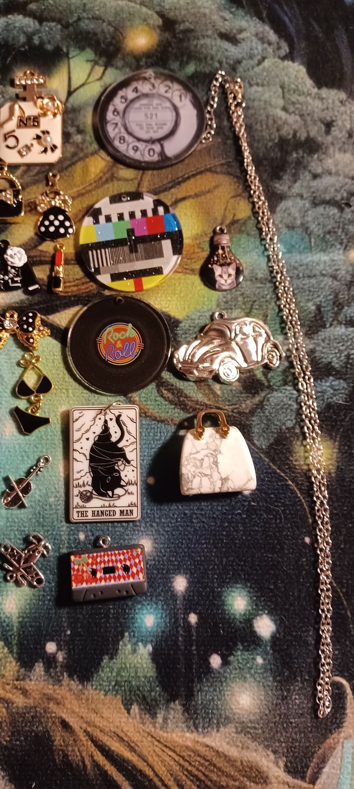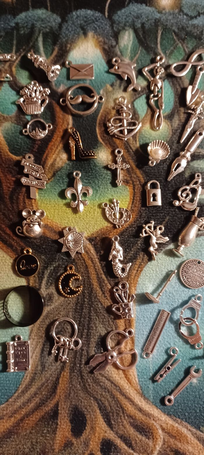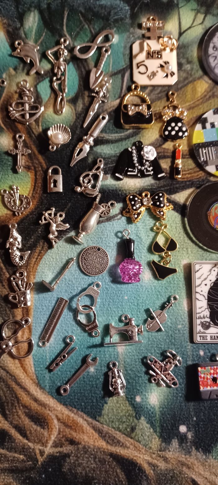 Vous trouverez les 36 charms classiques de la Célèbre Melle Lenormand, plus des charms sur le thème de la mode, de la femme fatale, des charms acryliques vintage pour fabriquer des porte clés, des pendentifs, des boucles d'oreille... Au total 86 charms , breloques et 1 pendentif pierre naturelle, 1 chaîne.