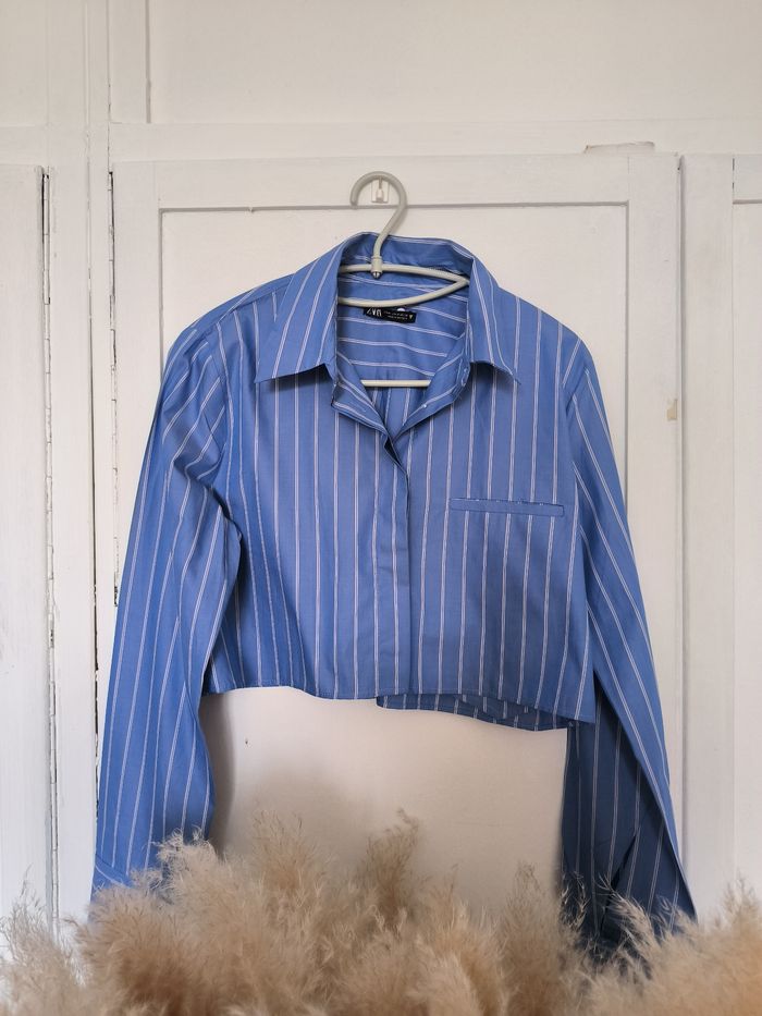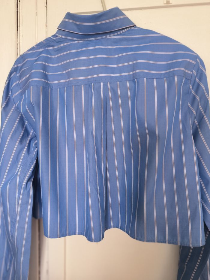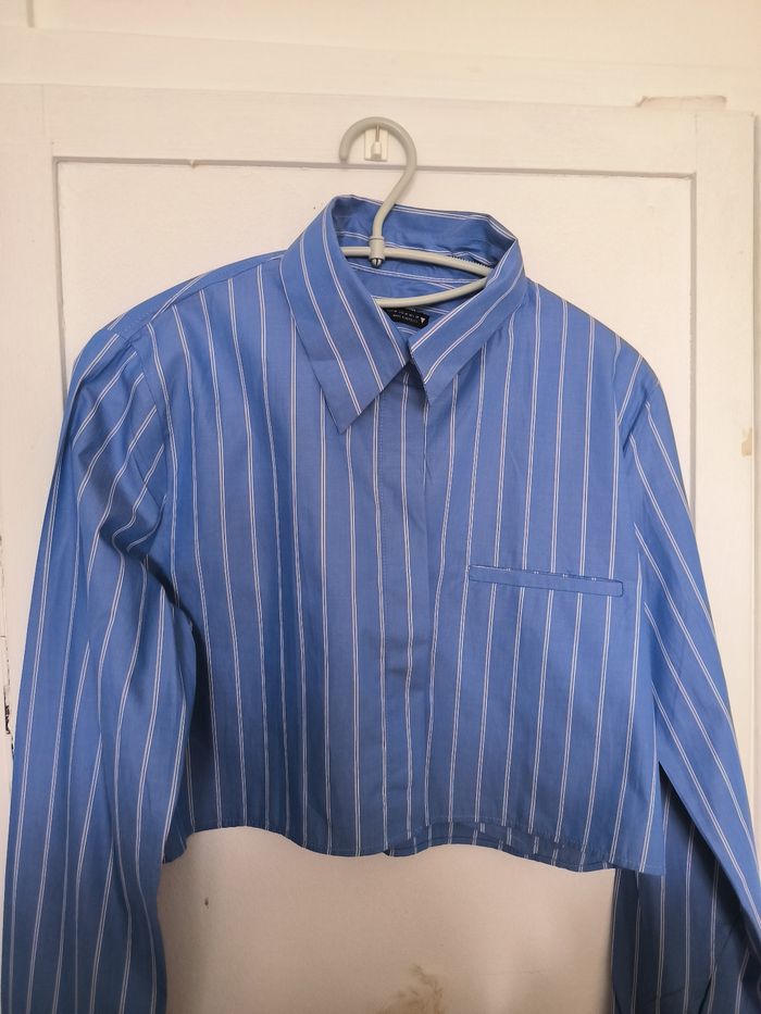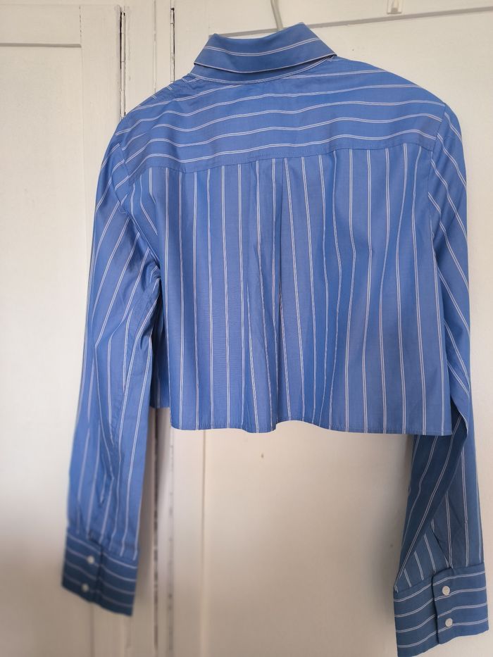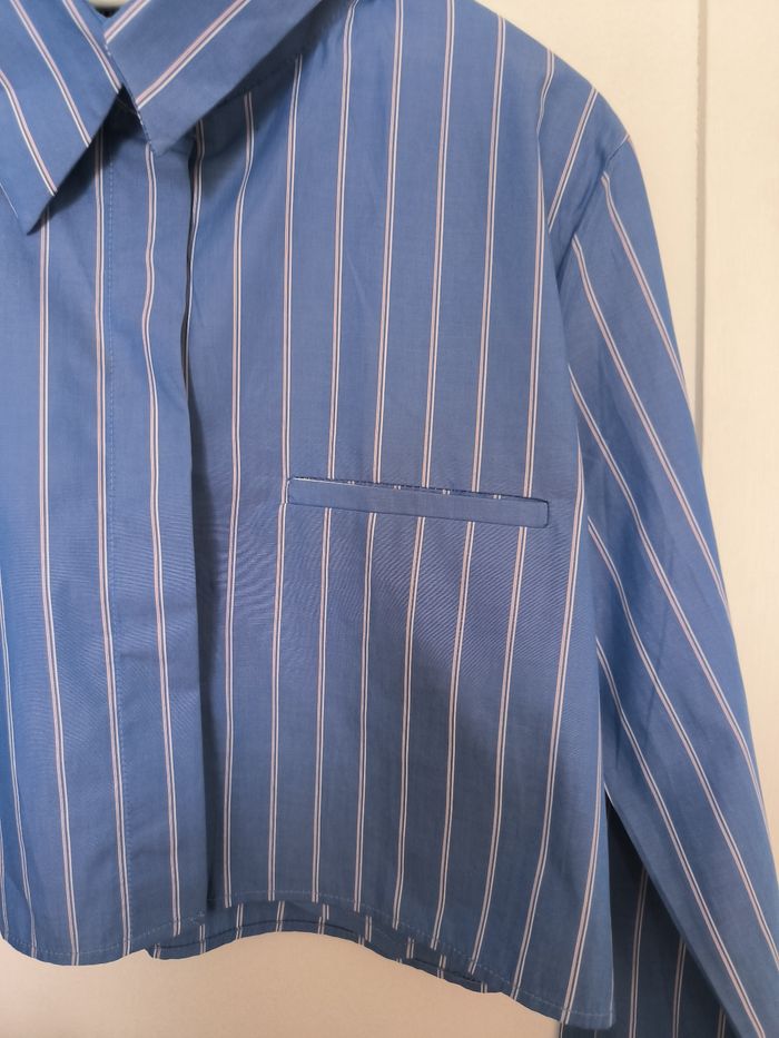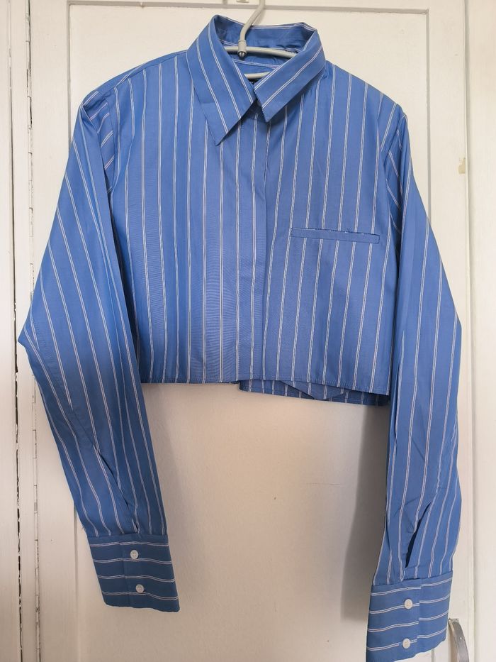 Beau crop top a rayures bleues et blanches Taille M avec les manches longues Col chemise Fermeture bouton devant et manches Une fausse poche