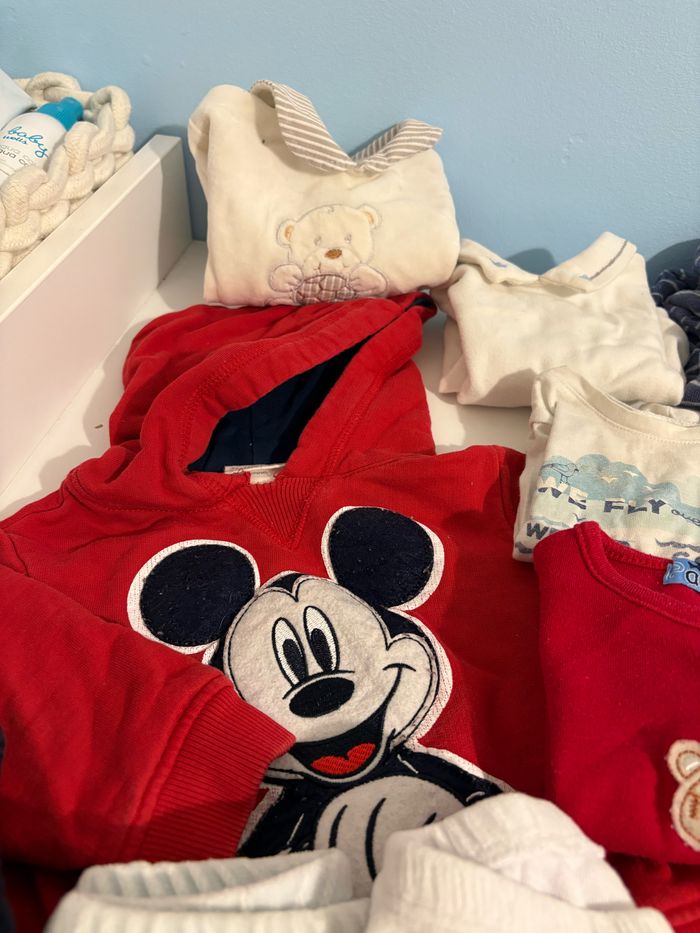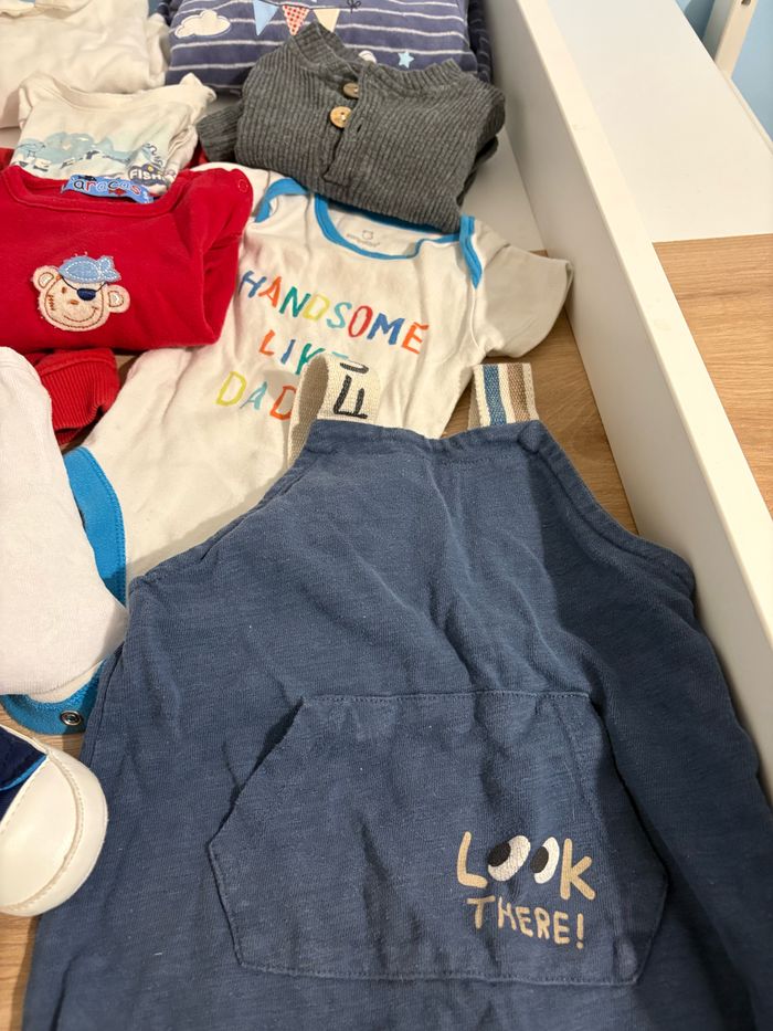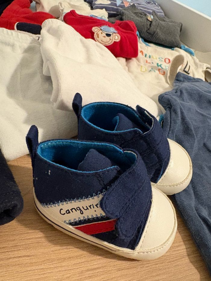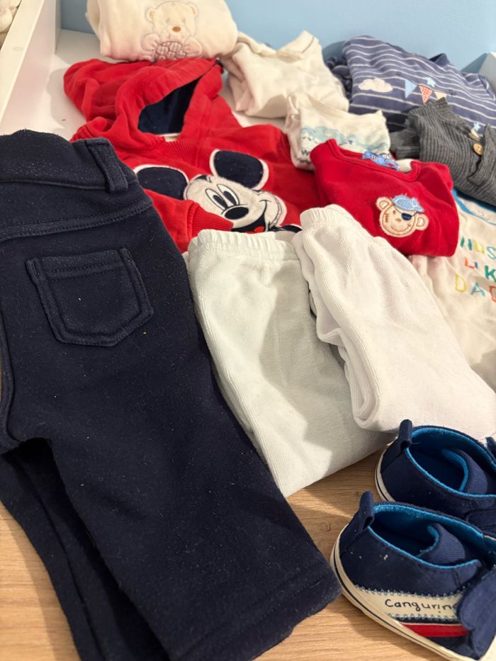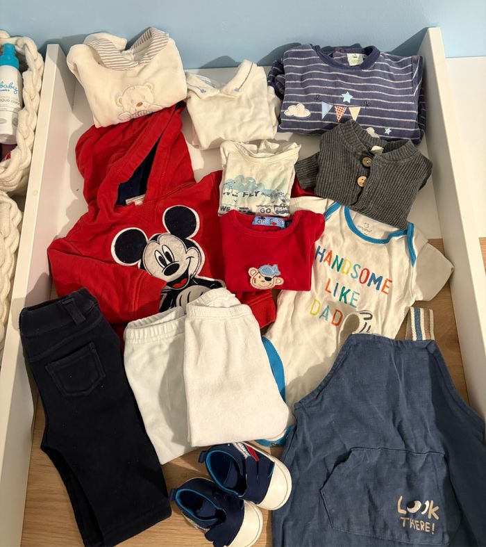 •1 chaussures (16) •2 blouses pyjama •2 pantalon pyjama •1 pantalon bleu •2 blouses manches longues •2 body •1 salopette •1 babygrow Toutes les articles sont en très bon état