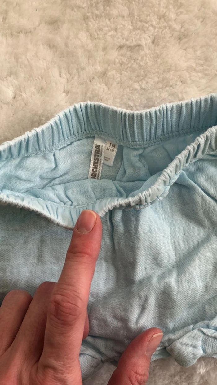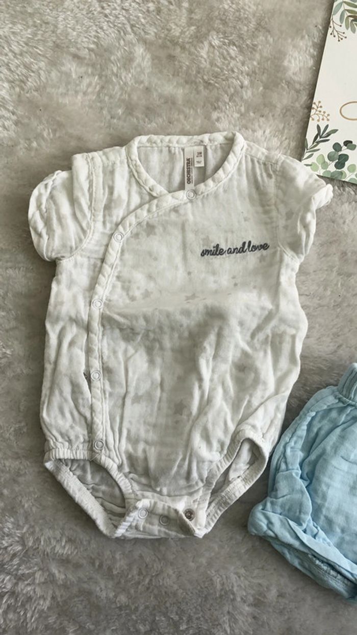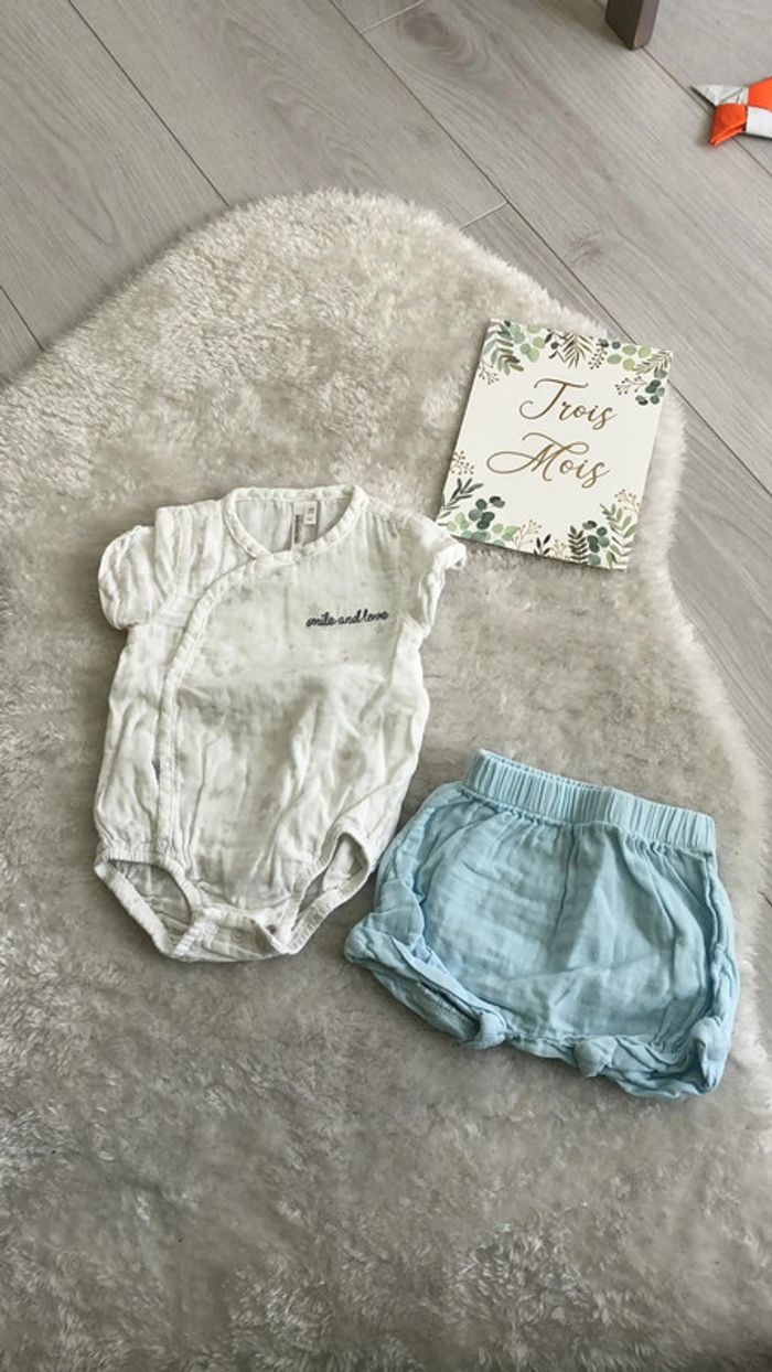 Ensemble garcon été 1/3 mois Le Bodie est en 3 mois et le short en 1 mois mais moi j’ai mis les 2 ensembles à mon bébé. Très joli Très bon état #mvinceneux3mois