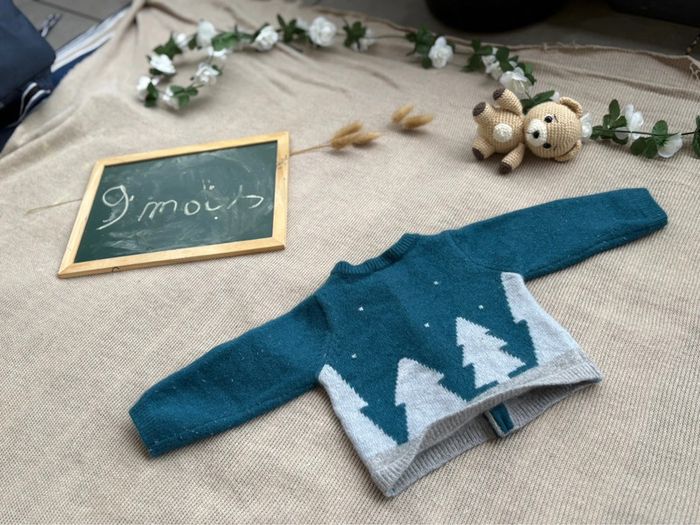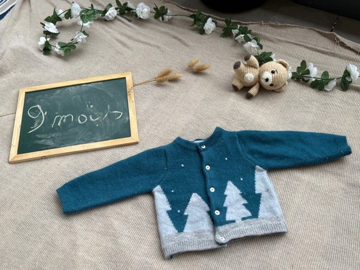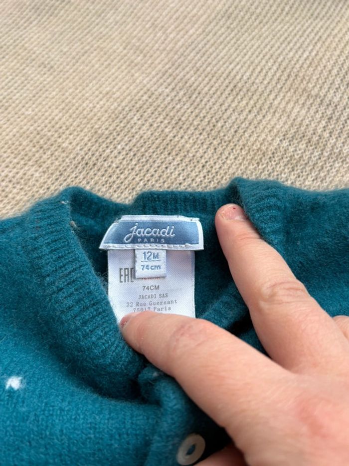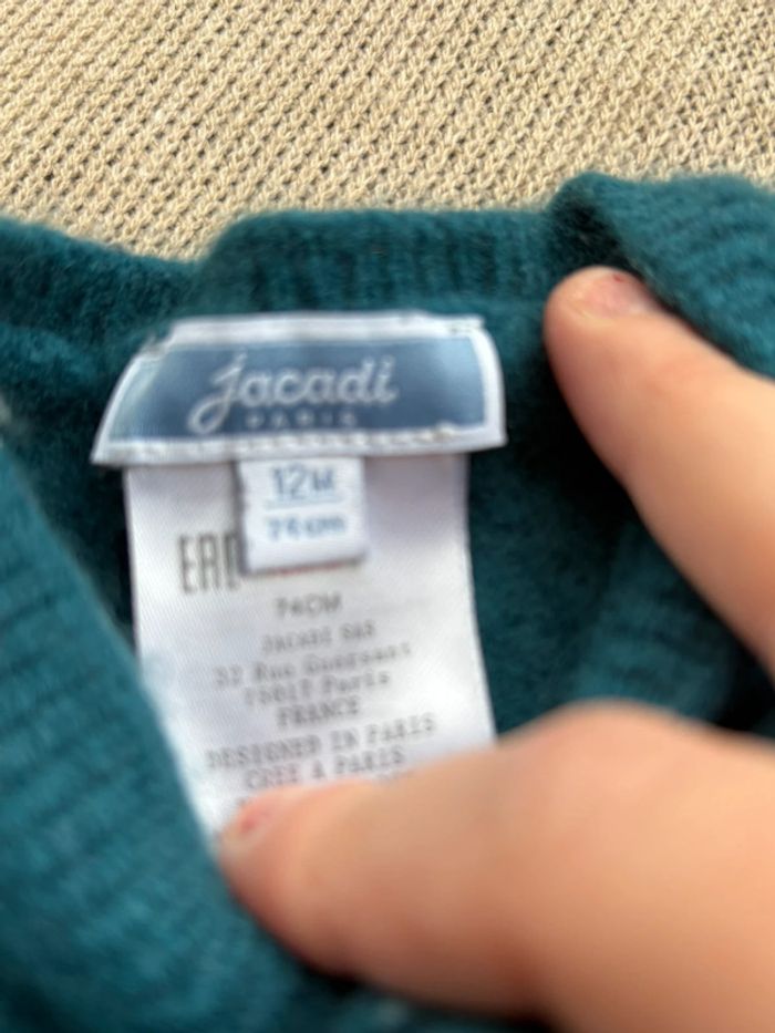 Petit gilet en laine, jacadi très jolie, taille petit ok pour un bébé de 9mois. Bon état, quelques légère bouloches dans le dos quasi pas visible